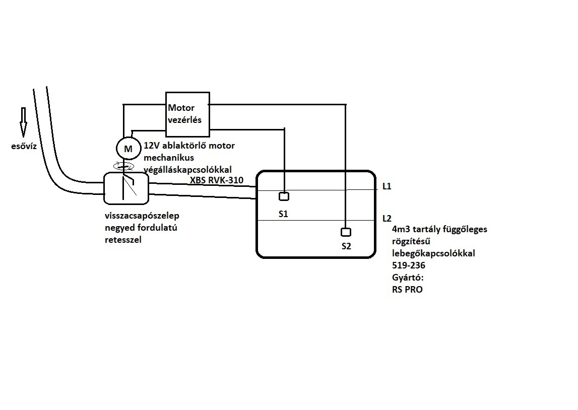 Köszönöm a válaszokat!!! Így van, ez egyfajta töltő/ürítő rendszer volna. Automatizálva csak a töltő oldal lenne, a szivattyú manuálisan lenne kapcsolva, amikor szükséges. A lényeg, hogy az esővíz ne haladja meg az L1 szintet, a visszacsapó szelep zárva legyen. Amikor pedig eléri az L2 szintet, nyisson ki. Megpróbáltam csinálni egy vázlatot, hogyan képzeltem el a működést. Remélem, sikerül csatolni.