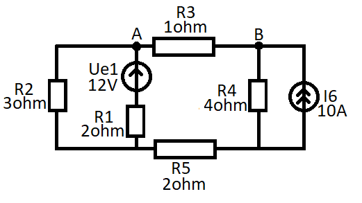 Utána a szuperpozíció tételét kihasználva először számold ki az A-B pont közötti feszültséget az egyik generátorral (miközben a másik 0V feszültségű, és a helyén rövidzár van). Utána a másik generátor által létrehozott feszültséget számold ki az A-B pontok között. Mindkét számítást előjelhelyesen kell végezni, az eredmény a két feszültség algebrai összege lesz.