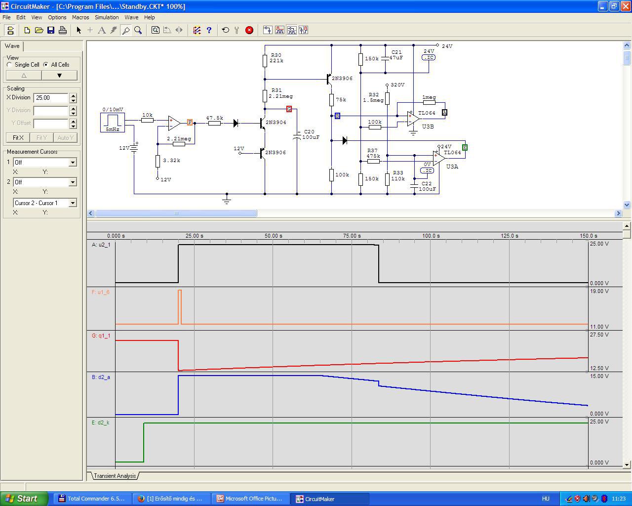 A Stan-by rész feszültségszintjei ott vannak a diagramon, de: "A" mérőponton bekapcsolva 12 V, kikapcsolva 24 V. "B" mérőponton bekapcsolva 14 V, kikapcsolva 0 V. "C" mérőponton bekapcsolva 22 V, kikapcsolva 2 V. U3A akart lenni egy bekapcsolási késleltetés, de elszámolták R33, R32 osztót ezért kapcsolgat ki-be. R33-at ki kell cserélni 15k-ra és esetleg C22 megnövelni. Ezt ki kell kísérletezni. Látom, hogy két párhuzamos 62k korlátozza a relé áramát. Nincs ezzel semmi gond. Ilyen