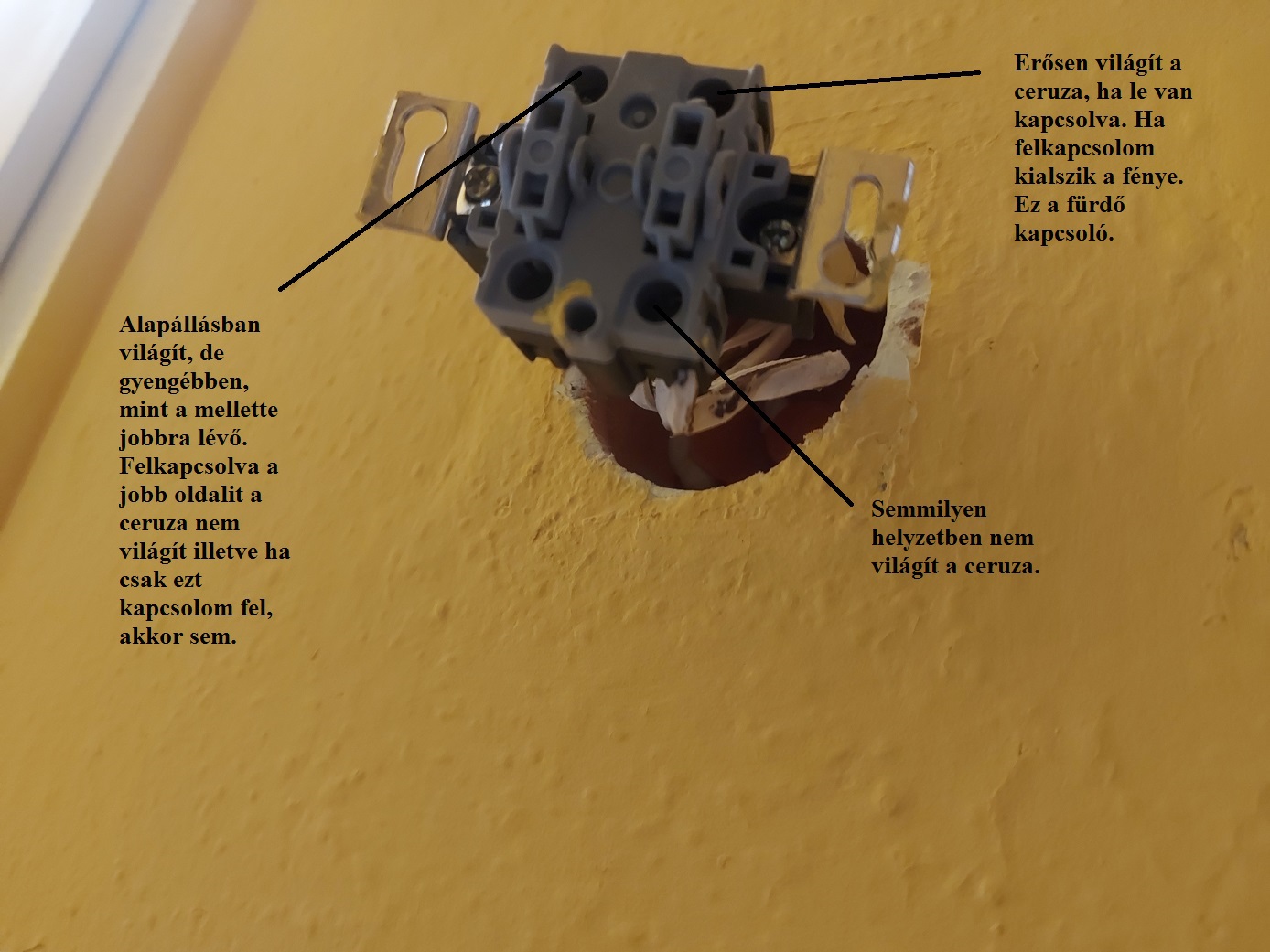 A fürdőben van egy mennyezeti és egy mosdó feletti spot lámpa, ahol lekapcsolt kapcsolónál mindkét kábelen világít a ceruza. Ha felkapcsolom, akkor a barna megszűnik. Hogyan lehet ez? Mit kötöttek itt össze és mivel?