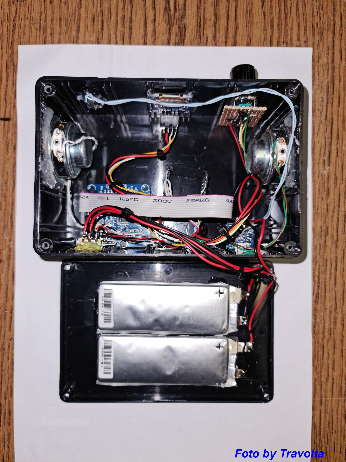 0.96" OLED LCD, rotary encoder, 1003 DAC, ESP32, 2x3W amp., meg kapott egy power bank elektronikát is. 2db 3.7V kb. 2200mAh-ás (drónból bontott) akksi táplálja. Az akksik egy kapcsoló segítségével, csak kikapcsolt állapotban, vannak párhuzamosan kötve, ilyenkor a power bank elektronika mindkét akksit tölti. Bekapcsolt állapotban az egyik akksit leválasztja, és a leválasztott akksi táplálja a végfokot. Ennek az volt az oka, hogy ha a végfok betápja galvanikus kapcsolatban volt a DAC tápjával, iszonyat digitális zaj hallatszott a hangszóróból.