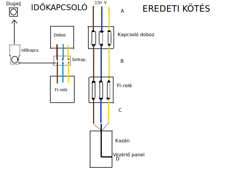 Először is elnézést kérek, ha nem jó topikban teszem fel a kérdésemet. Koromnál fogva sem, megy egyébként sem sokat értek az elektromos kapcsolásokhoz. Tudom, akkor forduljak villanyászhoz. Így tettem, de nem lettem okosabb. Segítséget kérek egy időkapcsoló beépítéséhez a központi fűtés rendszerbe. Elnézést a kontár rajzokért, de csak ennyire futja. A jobb oldali rajzon látható a jelenlegi bekötés. Dugvilla nélkül, FI-relén keresztül közvetlenül be van kötve a kazán a hálózatra. Eddig szobatermosztát vezérelte a kazán be-ki kapcsolását. Most azonban egy időkapcsolót is szeretnék beépíteni, kordában tartani a fogyasztást, mellőzve a komfortérzetet. De nem tudom hogy ( A B C D ) pontok valamelyikére, vagy hová kellene beépíteni, ill. hogyan? Villanyászom szerint - ami valószínű nem jó - a baloldali rajz szerint egy sorkapcsot kellene berakni a kapcsoló doboz és a Fi-relé közé. Az ebből kijövő vezeték másik végére egy dugvilla, ez menne az időkapcsolóba, az meg a dugaljzatba. Pl. időkapcsolón beállítom, hogy 10-12 óra között adjon áramot a kazán felé, egyébként zárjon. Ilyenkor elméletileg az áram halad a dugaljzat-időkapcsoló-sorkapocs-Fi-relén keresztül a kazánhoz. Ugyanakkor a dobozból IS megy áram a sorkapocs- Fi-relén keresztül a kazánhoz. Azonban, ha az időkapcsolón keresztül nem mehet áram a kazán felé -pl- 13 órakor- akkor viszont az eredeti rejz szerint - doboz-sorkapocs- Fi-relén keresztül mégis kap áramot a kazán. Így nincs értelme. Akkor viszont mi a megoldás? Erre kérem segítségetek. Köszönettel: Joetata