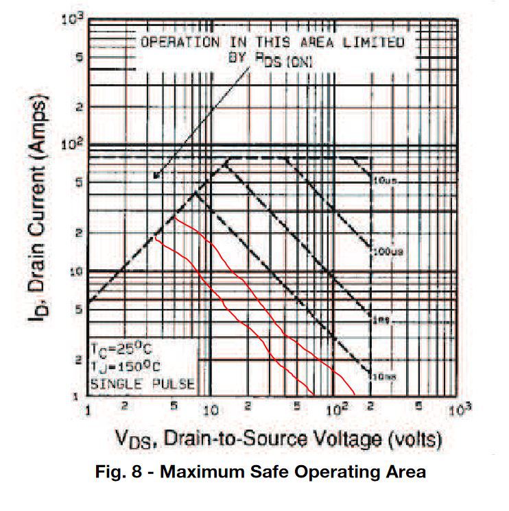 A Safe Operating Area diagramot érdemes még megnézni. Ez a FET kapcsolóüzemre van tervezve, nem lineáris üzemre, ezért nincs DC vonal az ábrán, de én berajzoltam kb. pirossal a 100mS ill. DC vonalakat. Amiből látszik, hogy kb 5A/10V vagy 2A/30V ami megengedhető. (Ha jó helyre rajzoltam a vonalat.) Illetve ez az ábra is csalóka, mert 150 fokos félvezető és 25 fokos tok hőmérséklettel számol, amit nem fogsz tudni tartani. ITT korábban már raktam be lineáris FET-ről SOA diagramot, nézd meg az ott leírtakat is.