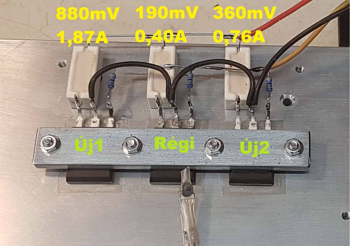 Most találomra előhúztam a fiókból 3 db IRFP240-et. Két különböző vásárlásból származnak. 0.1 Ohm-os Source ellenállás. Az áramok: 1.12 A, 1.26 A, 1.19 A. Vagy "normális" alkatrészt kell használni, vagy be kell válogatni, vagy külön opampról kell meghajtani mindegyiket. Szabadon választott.