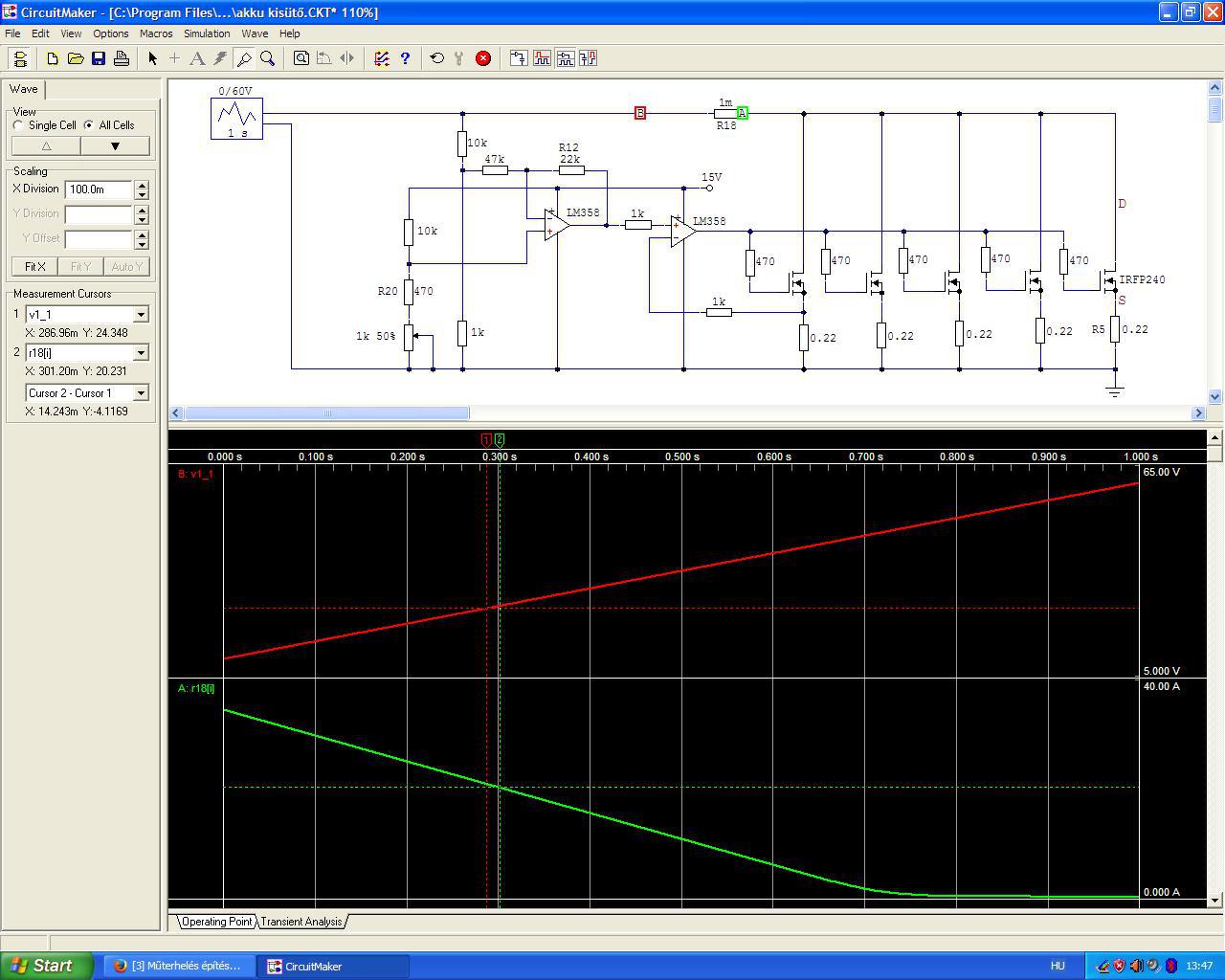 Idézet: „Az én igényeimnek egy olyan műterhelés felel meg, ami 10V alatt legalább 30A-t tud, felette olyan 25-26V-ig 15A még kellhet, ennél nagyobb feszültségen pedig nem is nagyon fogom használni, maga a "vezérlő" áramkör jelenleg úgy van méretezve, hogy 12V ig 35A a maximálisan beállítható áramerősség, 13-26V-ig 15A, felette 5A egészen 60V-ig, ahol a terhelőáram leesik 0-ra.” Ezen az adatlapon berajzolták a DC "vonalat" is. Számolok. Engedjünk meg 75C tokhőmérsékletet. 150W*0.6=90W. Ekkora teljesítményt tud eldisszipálni a FET. (Figure 1.) A SOA szerint ez 12V Uds-nél, 12A 25 fokon, tehát 7.2A 75 fokon, ami 3.6Amax/24V és 1.2Amax/60V. A tokon lévő disszipációs teljesítmény ekkor: 86.4W / 86.4W / 76W A lapka és a tok közötti hőmérséklet különbség 0.83 C/W hővezetéssel: 86.4W*0.83 C/W=72C Ebből a lapka hőmérséklet: 75C+72C=147C fok. 5 db IRFP párhuzamosan tud maximálisan 36A-t 12V-on, 18A-t 24V-on és 6A-t 60V-on. Ha 20% a FET-ek szórása, akkor kell legalább 6 db. Feltételeztem, hogy a hűtőborda és a tok között nincs szigetelő alátét. Az IRFP240 ára a RET-nél jelenleg 1000Ft/db és ezek egyformák.