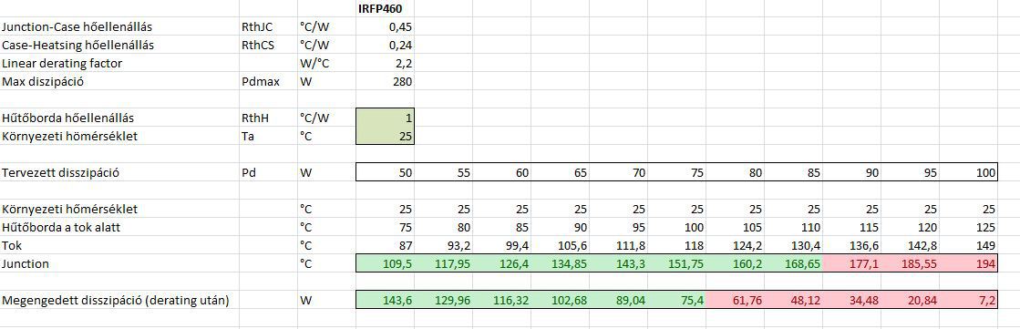 Ha 25 fok a környezeti hőmérséklet, és mondjuk az 1db FET-et ilyen szép hűtőbordára tesszük (116x100x40mm) aminek 1,6K/W a hőellenállása, de mondjuk ezt ventilátorral tegyük fel, hogy 1K/W-ra tudjuk letornázni, akkor hogyan alakul a tok és junction hőmérséklete a tervezett disszipáció függvényében, és mi a megengedett disszipáció az adott tok hőmérsékletnél. Ugyanez IRFP460-ra is, aminek a Pd-je 150W helyett 280W és a junction-case termikus ellenállása 0,83 helyett csak 0,45. Ami látszik, hogy a 75 fokos tokhőmérsékletet még 50W-os disszipációnál sem lehet tartani ilyen hűtőbordán. Látszik, hogy a kívánt disszipáció milyen tok hőmérsékletet eredményez, és ebből az adatlapban megadott Linear derating factorral visszaszámolom, hogy az adott tok hőmérsékleten mekkora disszipáció a megengedett. Ez alapján a fenti körülményeket figyelembe véve 60W-ig elmehetek IRFP240 esetén, IRFP460-nál 75W-ig. (De számítás nem számol tartalékkal, a junction hőmérséklet 175 fokig mehet, és az előző hozzászólásomban említett thermal instability sincs figyelembe véve, szóval a valóságban eddig sem mehetek el ezzel a bordával.) Ha ennél jobb hűtést csinálok, vagy nagyobb környezeti hőmérsékletre méretezem, akkor nyilván ezek az adatok változnak, hogy lehessen vele játszani felteszem az xls-t is. A tok és a borda között csak hővezető pasztával számolok, ha van szigetelő alátét is, akkor annak a hőellenállását hozzá kell adni a borda hőellenállásához. A hozzászólás módosítva: Okt 27, 2022