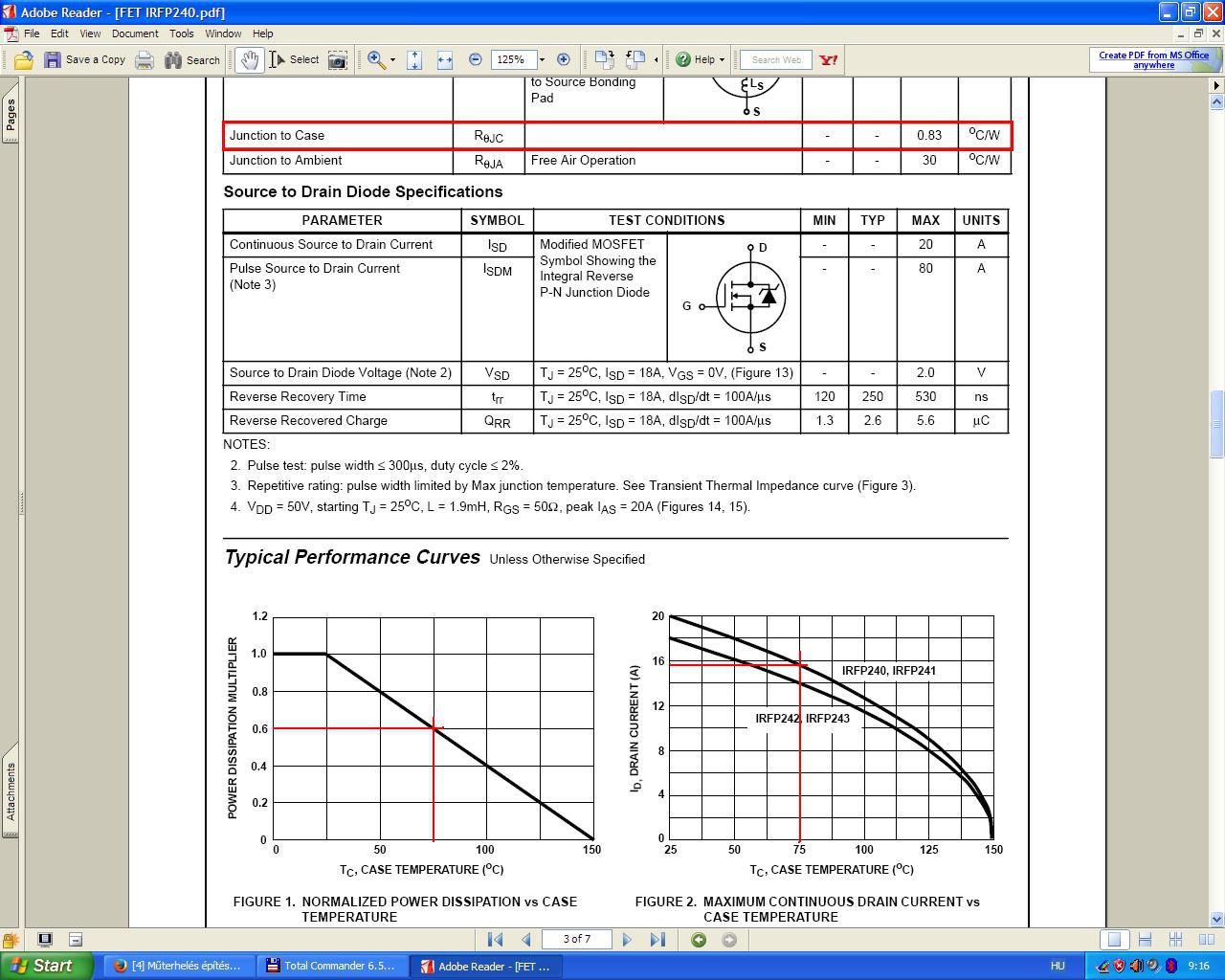 Idézet: „Az én igényeimnek egy olyan műterhelés felel meg, ami 10V alatt legalább 30A-t tud, felette olyan 25-26V-ig 15A még kellhet, ennél nagyobb feszültségen pedig nem is nagyon fogom használni, maga a "vezérlő" áramkör jelenleg úgy van méretezve, hogy 12V ig 35A a maximálisan beállítható áramerősség, 13-26V-ig 15A, felette 5A egészen 60V-ig, ahol a terhelőáram leesik 0-ra.” Ezen az adatlapon berajzolták a DC "vonalat" is. Számolok. Engedjünk meg 75C tokhőmérsékletet. 150W*0.6=90W. Ekkora teljesítményt tud eldisszipálni a FET. (Figure 1.) A SOA szerint ez 12V Uds-nél, 12A 25 fokon, tehát 7.2A 75 fokon, ami 3.6Amax/24V és 1.2Amax/60V. A tokon lévő disszipációs teljesítmény ekkor: 86.4W / 86.4W / 76W A lapka és a tok közötti hőmérséklet különbség 0.83 C/W hővezetéssel: 86.4W*0.83 C/W=72C Ebből a lapka hőmérséklet: 75C+72C=147C fok. 5 db IRFP párhuzamosan tud maximálisan 36A-t 12V-on, 18A-t 24V-on és 6A-t 60V-on. Ha 20% a FET-ek szórása, akkor kell legalább 6 db. Feltételeztem, hogy a hűtőborda és a tok között nincs szigetelő alátét. Az IRFP240 ára a RET-nél jelenleg 1000Ft/db és ezek egyformák.