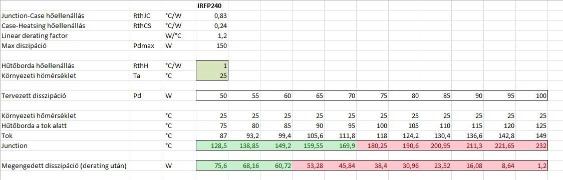 Ha 25 fok a környezeti hőmérséklet, és mondjuk az 1db FET-et ilyen szép hűtőbordára tesszük (116x100x40mm) aminek 1,6K/W a hőellenállása, de mondjuk ezt ventilátorral tegyük fel, hogy 1K/W-ra tudjuk letornázni, akkor hogyan alakul a tok és junction hőmérséklete a tervezett disszipáció függvényében, és mi a megengedett disszipáció az adott tok hőmérsékletnél. Ugyanez IRFP460-ra is, aminek a Pd-je 150W helyett 280W és a junction-case termikus ellenállása 0,83 helyett csak 0,45. Ami látszik, hogy a 75 fokos tokhőmérsékletet még 50W-os disszipációnál sem lehet tartani ilyen hűtőbordán. Látszik, hogy a kívánt disszipáció milyen tok hőmérsékletet eredményez, és ebből az adatlapban megadott Linear derating factorral visszaszámolom, hogy az adott tok hőmérsékleten mekkora disszipáció a megengedett. Ez alapján a fenti körülményeket figyelembe véve 60W-ig elmehetek IRFP240 esetén, IRFP460-nál 75W-ig. (De számítás nem számol tartalékkal, a junction hőmérséklet 175 fokig mehet, és az előző hozzászólásomban említett thermal instability sincs figyelembe véve, szóval a valóságban eddig sem mehetek el ezzel a bordával.) Ha ennél jobb hűtést csinálok, vagy nagyobb környezeti hőmérsékletre méretezem, akkor nyilván ezek az adatok változnak, hogy lehessen vele játszani felteszem az xls-t is. A tok és a borda között csak hővezető pasztával számolok, ha van szigetelő alátét is, akkor annak a hőellenállását hozzá kell adni a borda hőellenállásához. A hozzászólás módosítva: Okt 27, 2022