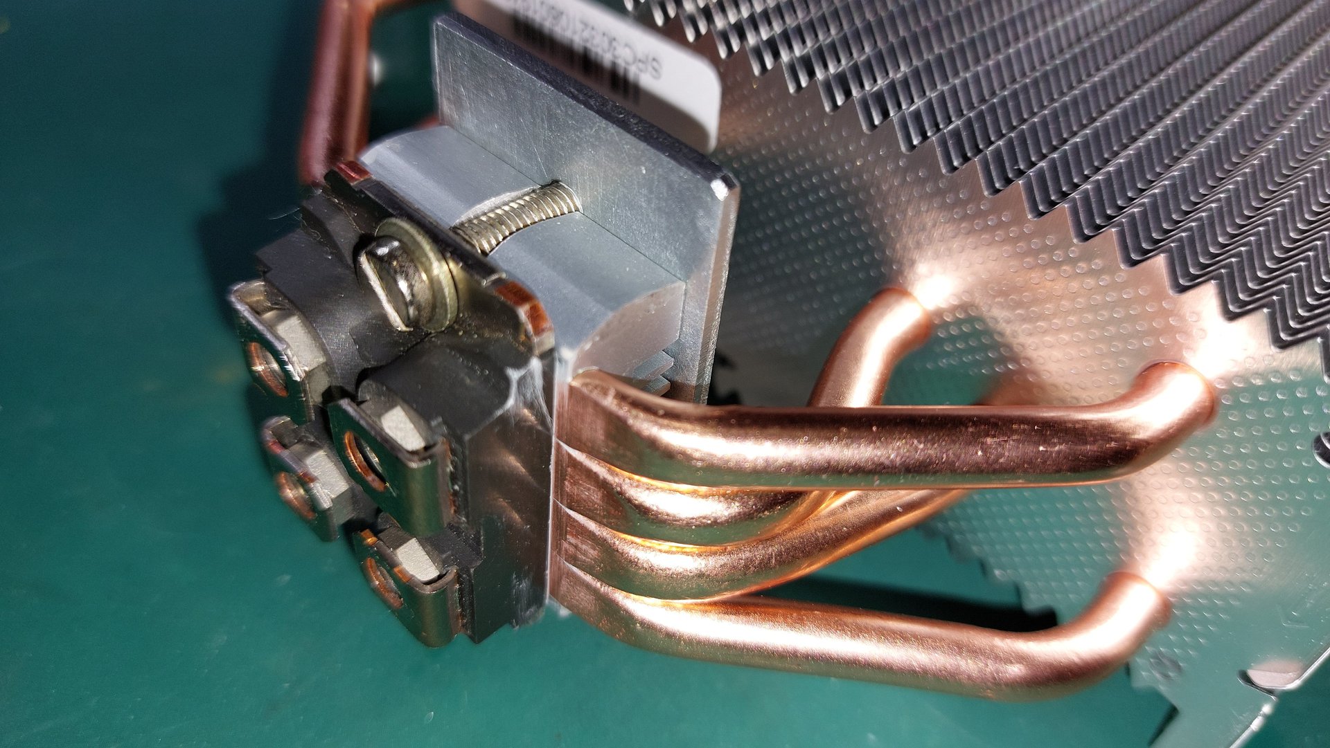 A FET TSD4M450V A hűtő pedig egy SilentiumPC Fera 5-ös hőcsöves CPU toronyhűtő. Eredetileg gondolkodtam klasszikus hűtési megoldásban is, de úgy érzem ide az kevés, még egy masszív borda esetén is. Pasztának a hűtőhöz mellékelt Pactum PT-3-at használtam. Erről sajnos hővezetési adatot nem találtam. A Fera 5 gyári adat szerint 220W TPD-t tud egy CPU esetén. Mondjuk ott annyiban mások a körülmények, hogy a Tj max 100 fokos lehet, míg nálam a Tj max 150 fokos lehet. A Rthjc-re gyári adatot nem találtam CPU esetén de valahol azt írták, hogy az intel nagy teljesítményű desktop processzorainál ez 0,3C/W ami hasonló a FET-em adatához. Az Anandtech csinált ezzel a hűtővel hőellenállás mérést, és EZT az eredményt kapták. Azaz max. ventilátor fordulatnál 0,17°C/W alatti értéket kaptak. Én 0,2°C/W-vel kiszámoltam a mellékelt táblázat alapján, és azt kaptam, hogy ezzel a hűtővel 25 fokos környezeti hőmérséklet esetén valahol 250W körül van a határ. A hőmérséklet méréséhez K típusú hőelemet használtam 2 helyen. Egyik a FET tokjának a tetején a négy csavar közötti pontban, ami pontosan a szilícium lapka tetején van. Igaz a műanyag rosszul vezeti a hőt, viszont ebbe az irányba a hőelvonás kicsi. A másik pont a tok felfogató csavarja melletti fém lap és műanyag találkozási pontja. Minkét helyre a hőelemet felragasztottam egy hőálló gyurmaszerűből kikeményedő ragasztóval, úgy, hogy a hőelem közvetlen érintkezzen. A második pont közel van a hőelvonáshoz, és minden esetben jóval kisebb hőfokot mért, ezért inkább csak a felső hőelem adatait írom le. A hőcsöves hűtés hatásfoka akkor a legjobb, amikor a csövek vége magasan van, azaz U alakban felfele, a FET pedig lent. A mérés során minden lépésnél 30 percig állandó teljesítményen üzemelt. Eredmények: P = 152W ---> Tc = 63°C P = 202W ---> Tc = 79°C P = 242W ---> Tc = 93°C Ennyit tud a labortápom leadni, így ennél magasabbra nem mentem. Viszont érdekelt, mi történik, ha más pozícióban vannak a hőcsövek. Erre is csináltam mérést : P = 152W ---> Tc = 63°C (FET alul, hőcsövek felfele) P = 152W ---> Tc = 65°C (FET oldalt, hőcsövek oldalra U merőleges az asztallal) P = 152W ---> Tc = 77°C (FET felül, hőcsövek lefele) P = 202W ---> Tc = 79°C (FET alul, hőcsövek felfele) P = 211W ---> Tc = 95°C (FET oldalt, hőcsövek oldalra U merőleges az asztallal) P = 214W ---> Tc = 97°C (FET oldalt, hőcsövek oldalra U párhuzamos az asztallal) P = 242W ---> Tc = 93°C (FET alul, hőcsövek felfele) P = 242W ---> Tc = 105°C** (FET oldalt, hőcsövek oldalra C alakban) ** 2 perc után volt ennyi, majd kikapcsoltam 150W-nál még majdnem mindegy volt, hogy fekve vagy állítva voltak a hőcsövek, de 200W-nál már jelentős a különbség. A fejre állítva egy extrém eset, de 150W-nál még az is bőven belefért.