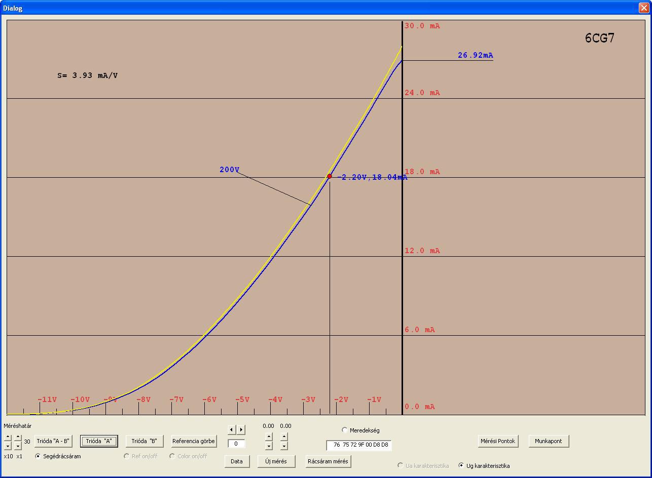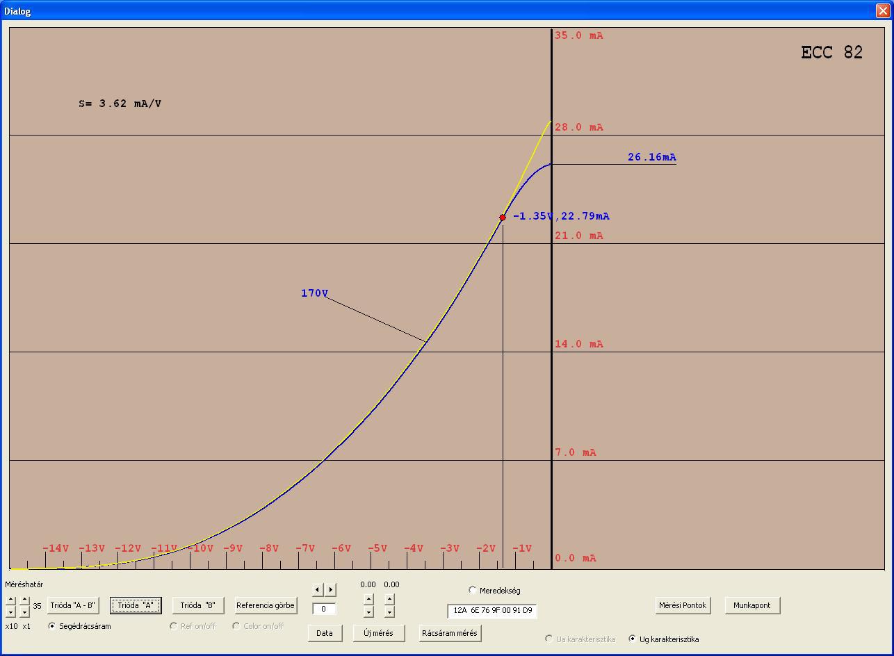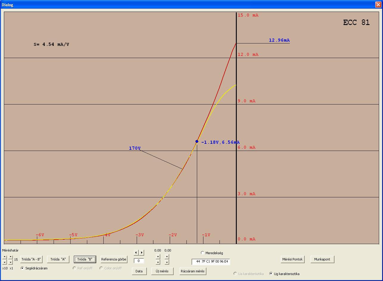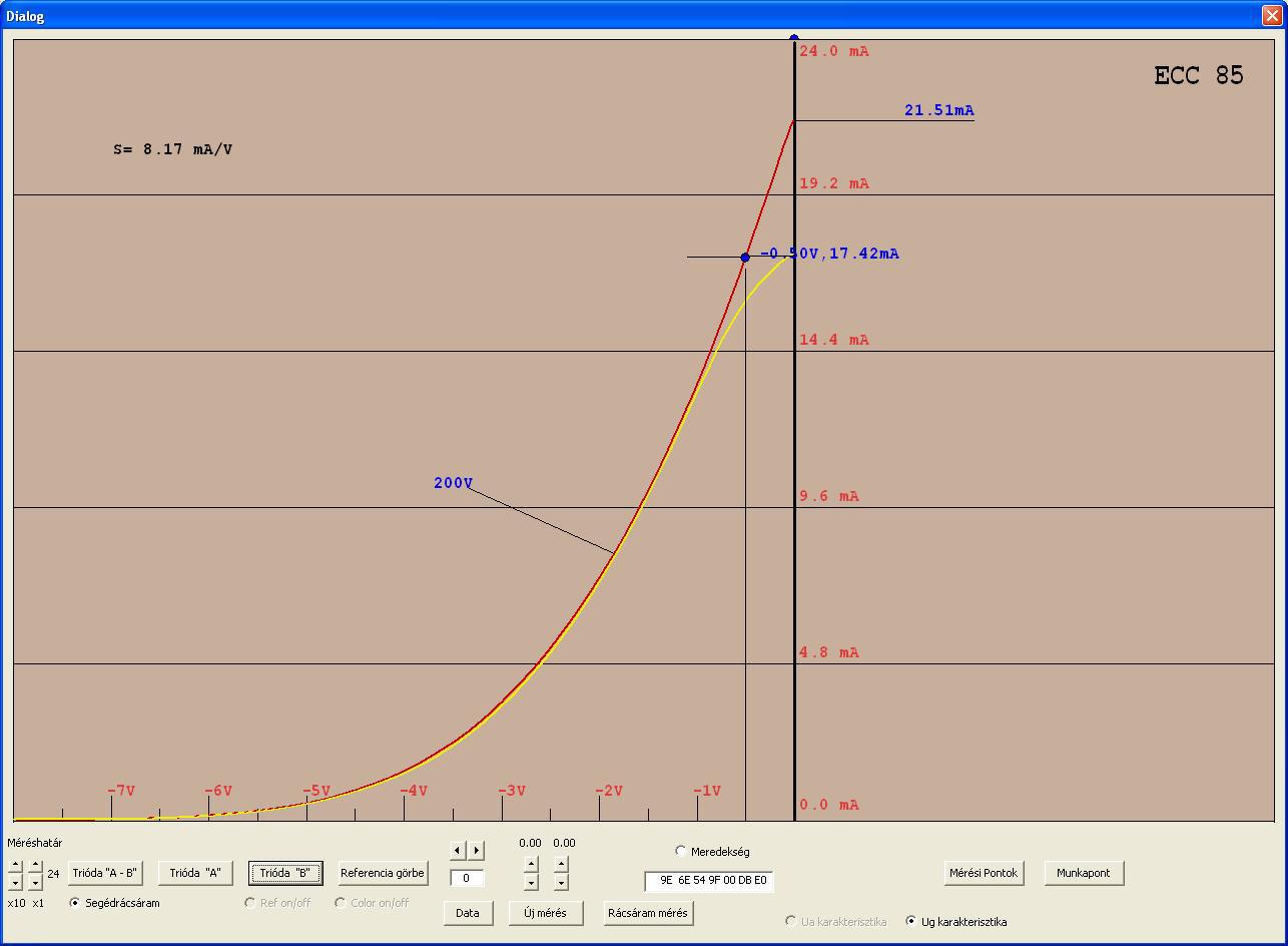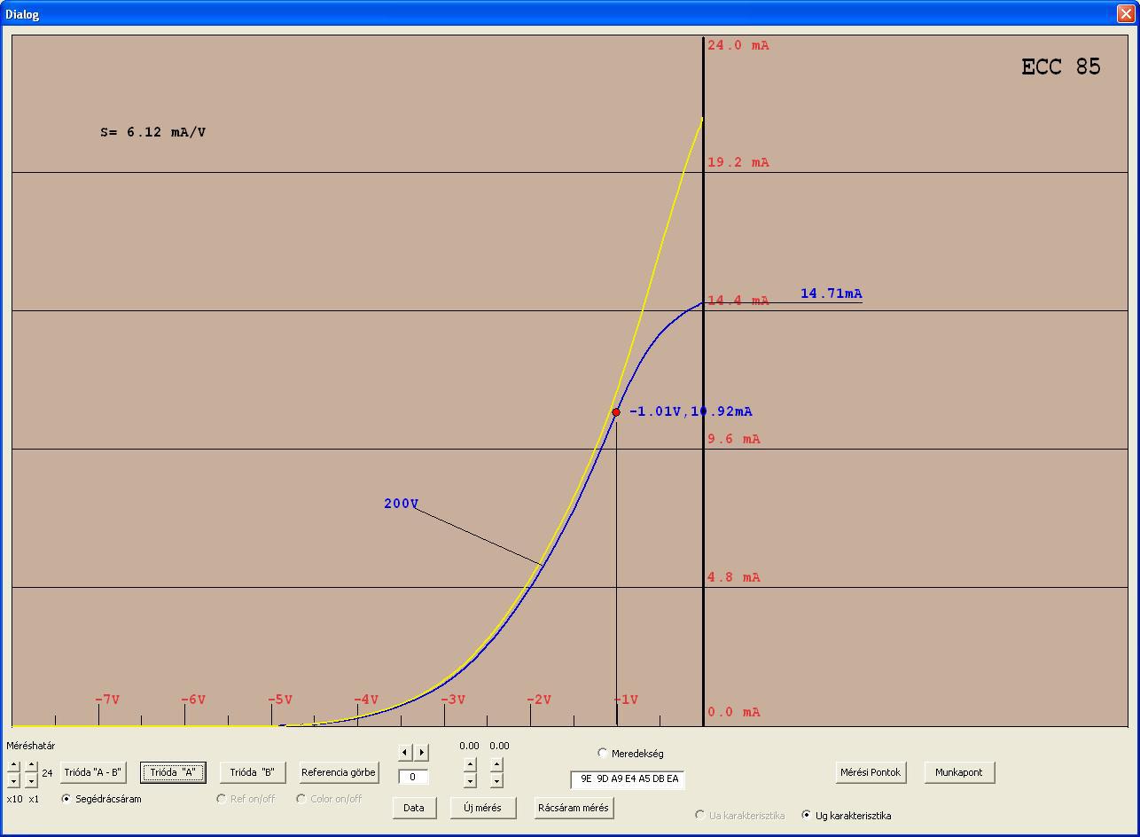Közben készítettem néhány gyakran használt csőről egy-egy karakterisztikát, szerintem elég tanulságos, hogyan is néznek ezek ki, illetve hogyan és mekkora anódáram változást okoz a sorba kapcsolt 1M-os ellenálláson eső rácsfeszültség.
