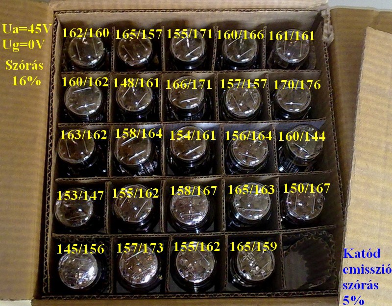 Nagy tévedésben vagy, de meg is hagylak abban, mivel elment a kedvem a rajzolgatástól. Éppen a 0V Ug mellett történő árammérés az (amit pucuka javasol) ami szinte semmi infót nem ad egy cső használtságáról, nem kell ezt nekem elhinni, ki kell próbálni, meg kell mérni. A képen van egy karton új cső, amikor megvettem lett a karton kibontva, tehát biztos hogy mind új. Rá vannak írva a 0V Ug melletti áramértékek mindegyik csőfél esetén, van 16% szórás alapból. Ellenben ha katódemissziót mérek, akkor csak 5% szórás van köztük. Na de, nem ez a nagy különbség a két mérés között, hanem az, hogy ha használok belőle két csövet pár hónapon vagy egy éven át, akkor a 0V Ug melletti árammérés pontosan ugyanaz lesz, semennyit nem változik, ellenben az emissziómérésen már látszani fog, hogy öregedett a cső! Lapozz vissza 3 oldalt, ott van a mérés ami tökéletesen cáfolja amit írtál.