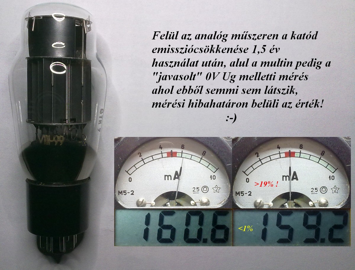 És, míg a 0V Ug melletti mérés nem ad eredményt arra vonatkozóan hogy mennyit volt használva egy cső (próbáld ki, mérd meg), mert az csak az adott cső tulajdonságait mutatja meg, addig a katódemisszió közvetlen mérése tökéletes képet ad a használtság mértékéről. A károsodással kapcsolatban is tévedésben vagy, megmérek neked így csövet ha kell akár minden nap, mondjuk 100 alkalommal, és a századikra is ugyanazt az értéket fogom kapni, ugyanis nem károsodik tőle a katód (ezt is kipróbáltam, na nem 100 csak 30 alkalommal). Amitől a katód elfogy, az a használat. Ezzel a méréssel már az is látszik a katódon, ha mondjuk csak 50-100 üzemóra van a csőben. Próbáld ezt megmérni az általad javasolt módszerrel... Ja, és az sem véletlen, hogy a valós emisszió mérésekről szóló cikkekben éppen 60%-os fűtőfeszültséget javasolnak, de most már ennek a lényegét is megtartom inkább magamnak... A hozzászólás módosítva: Nov 2, 2022