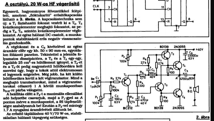 A kapcsoláson két poti van: P1 amivel a kimeneten lehet feszültséget állítani és P2 amivel a nyugalmi áramot. A probléma az hogy nem tudom a kimeneten a tápfesz felét beállítani ahogy írták. A nyugalmi áramot azt tudom állítani. Tápfeszem terheletlenűl 42V. A P1-es potival max 14V-ig tudom beállítani a tápfeszt. Aztán adtam neki vezérlést. Hát konkrétan nem csinál semmit. ami bemegy jelszint annyi jön ki rajta 8ohmos terhelés mellett. 600mV vezérléssel 620mV-t mutat a szkóp a kimeneten... + van egy 47ohm a felső végtranyó bázisán.