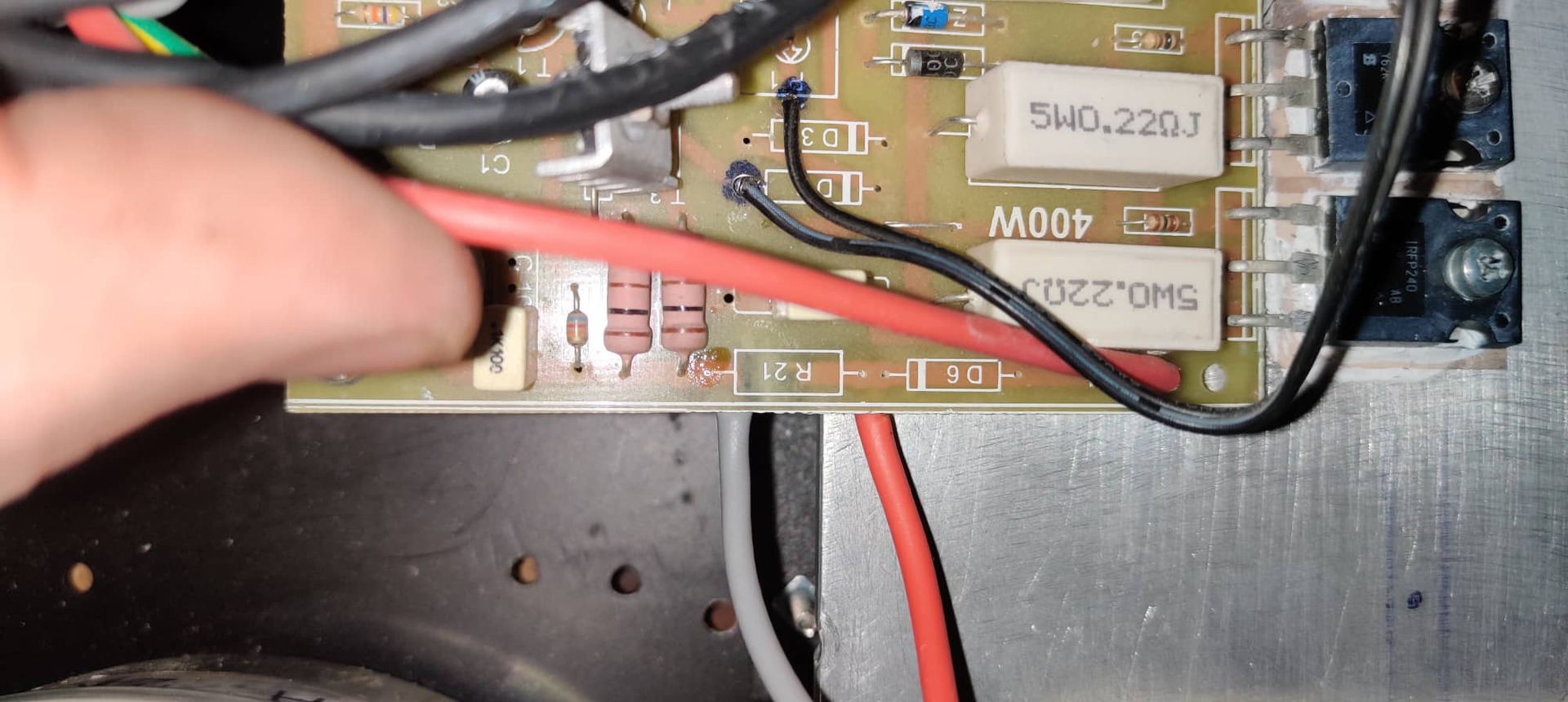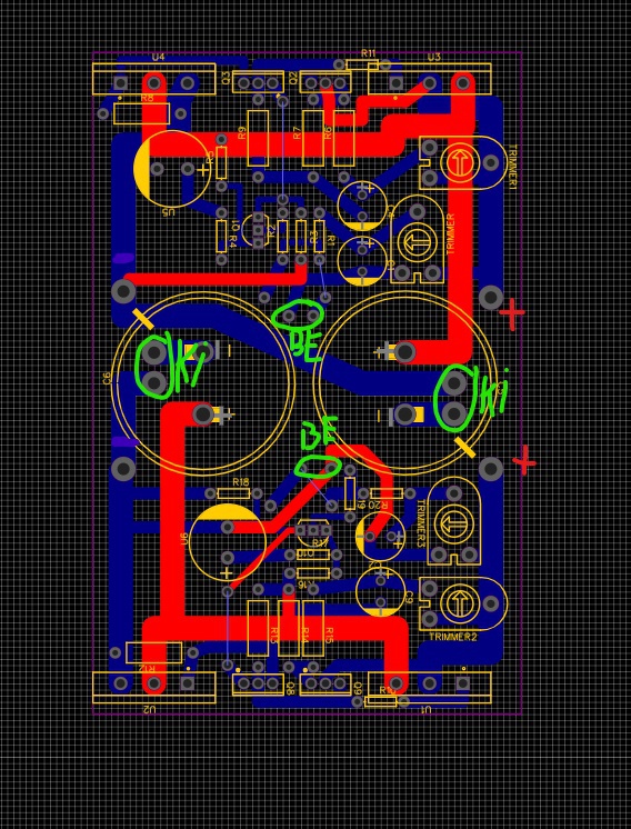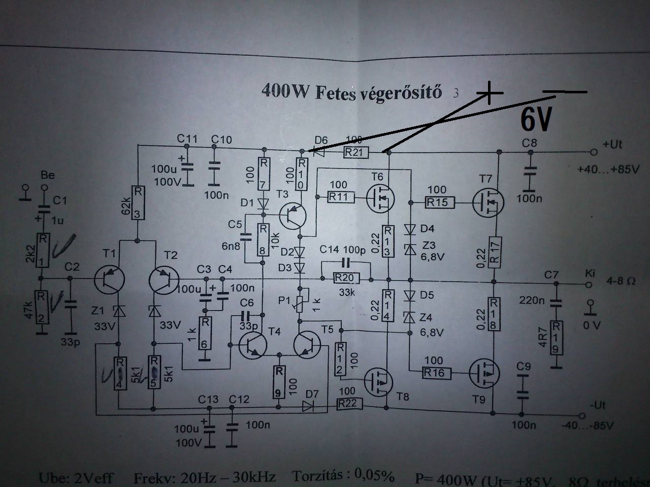 Sziasztok! Itt szeretnék egy +-5v bufferfokozatot, ebbe a fetes erősítőbe! Alul a D6 R21 alatt a fóliát elvágtam.