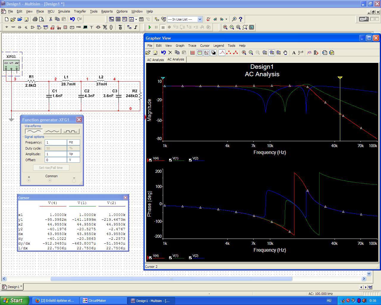 A szűrőelméletet szerintem már Csebisevék tisztázták. A különböző fokszámú szűrők együtthatóinak táblázata benne van a Tietze - Schenk könyvben is. Igen, ez valóban ötödrendű szűrő... a CM fájl is ezen a néven van elmentve, hogy bármikor megtalálhassam : ) A Multisim mit mutat?