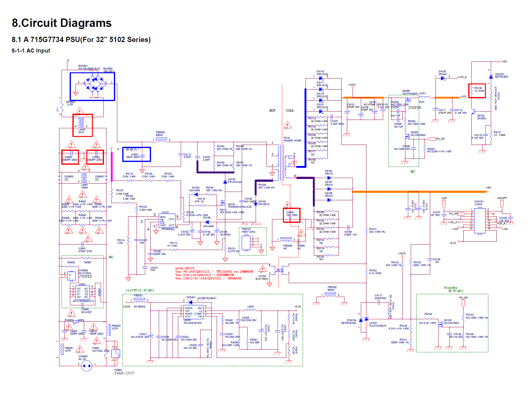 ![]() (Semmi baj a törökökkel, csak én akadtam el) Előrebocsátom: semmi baj a maín-al, sem mással, (kipróbáltam másik táppal), kizárólag a tápegység beteg. Szóval: a halott tápegységen kicseréltem -Q9101 -C9126 -R9111 -R9109 -R9110 -R9113 -D9104 U9101 (ezzel megyűlt a bajom) És mi történt? Kifelé akár a 12, akár a 18 V helyett 3,2V... A nagy kondenzátoron 325V-ot mértem, a Fet "S"lábán hullámzó 325-290V-ot. Azt márcsak nyalánkságként teszem hozzá, hogy bánatos méregetés közben elciccentettem az egészet végül. Holnap mehetek mosFet-ért, a többi van) Mi lehet még a baj? A hozzászólás módosítva: Nov 20, 2022