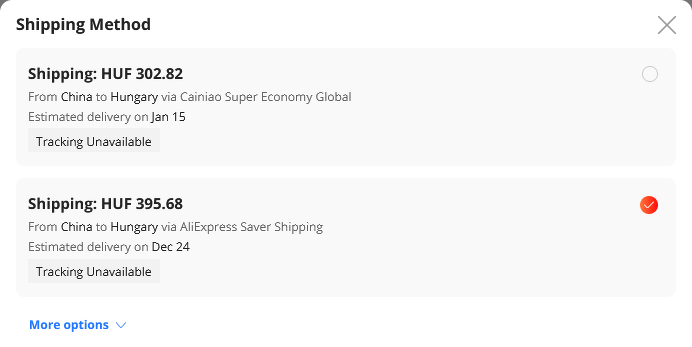 Sajnos nem mindig opció a Aliexpress saver shipping, esetenként van hogy jóval drágább, mint amit a posta rátenne, ilyenkor van a szerencsejáték, a Cainiao hol így, hol úgy jön.