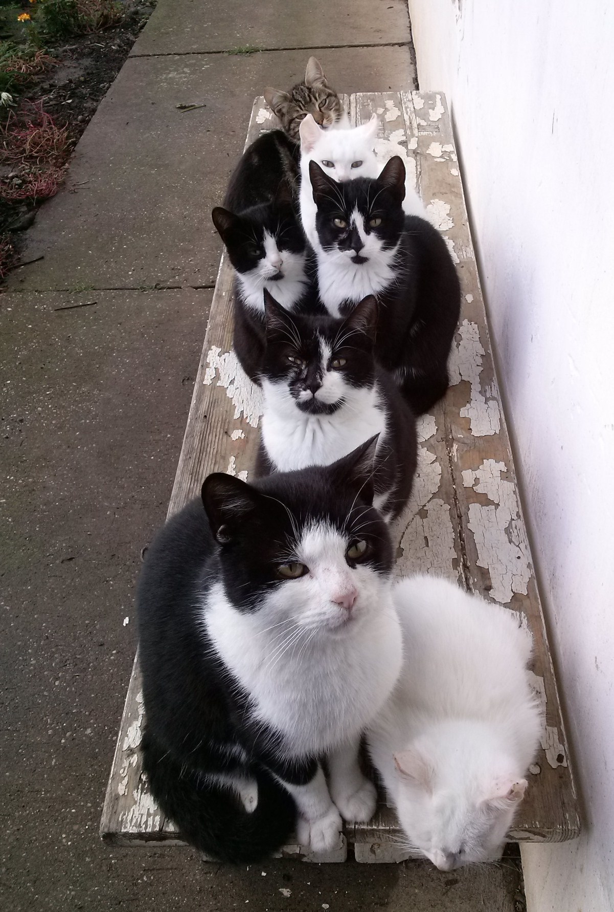 Ezek nem hobbi macskák, hanem vadállatok. Szétrágnák a házat az egerek ha nem lennének. A csúcsállomány 32 db macska volt, de tavalyelőtt például csak három... akkor rengeteget küzdöttem az egerekkel. Ha csak 5-6 db van, akkor még motoszkál egér a padláson, de előbb-utóbb megfogják. Ez a tíz körüli az optimális létszám, az idén még nyomát nem láttam betolakodóknak. Csak hát esznek, mint a sáskák... egy kutya-konzerv a reggeli, fél kiló macskatáp az ebéd, fél kiló baromfi párizsi a vacsora. Szerintem egész nap csak az estét várják. De nem lehet megsimogatni egyiket sem - még nekem sem állnak meg - de ez így van jól. A szelíd macskák itt nagyon rövid életűek.