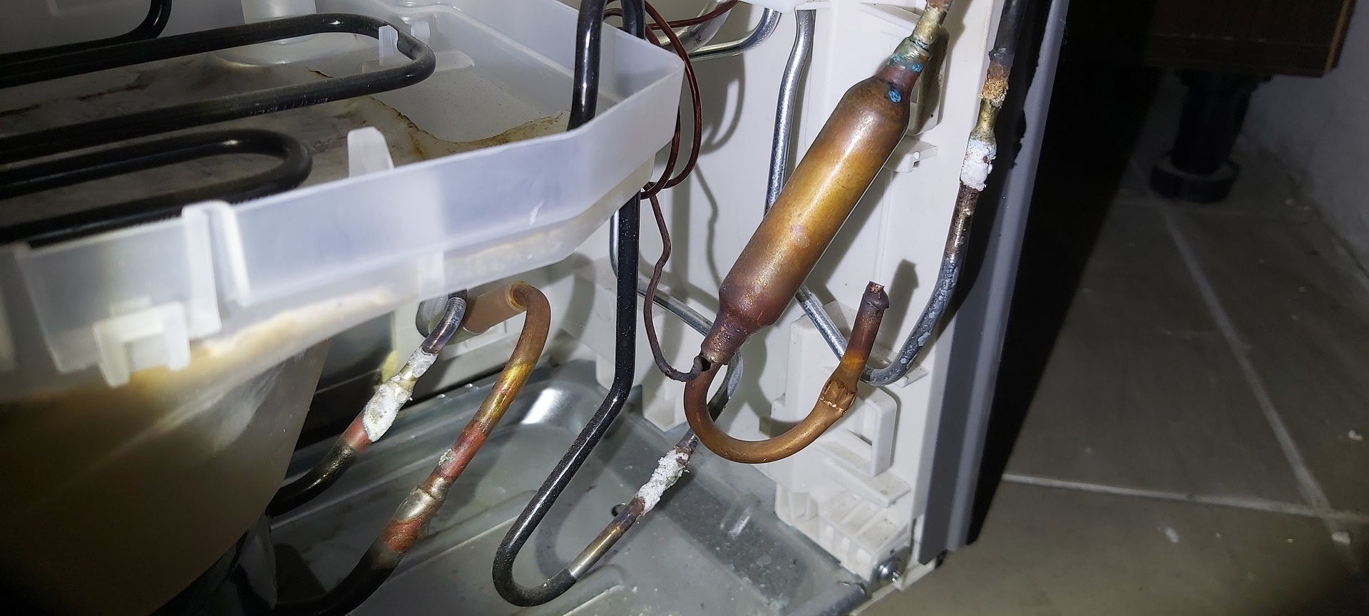 A csöveknek semmi baja, egy kis folyasztószer maradvány, a tálcából meg azért nem párolog, mert ott a tetején a penész, ami lezárja a víz felszínét, így nem tud elpárologni. Ki kell mosni a tálcát, és ha hűt rendesen a hűtő, és megfelelő hőmérsékletű helyiségbe van, akkor nem lesz vele gond.
