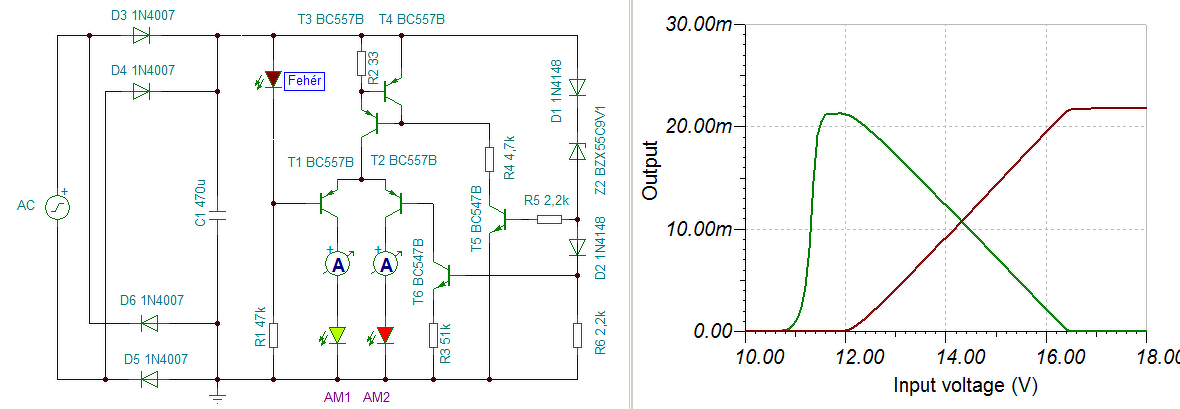 Van egy közös katódú kettős LED. AC 8 és 12 V közötti feszültségváltozást kellene neki indikálni úgy, hogy 8 V -nál az egyik 10 V nál mindkettő fél fényerővel, 12 V -nál a másik világít. A köztes állapotokban a feszültségek arányában tolódnak a fényerők. Egyszerű néhány tranzisztoros megoldásra gondolok, a kapcsolás a saját tápját is a változó AC 8-12 V -ból állítaná elő.