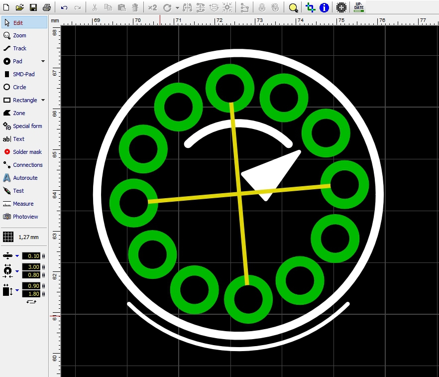 Közben megcsináltam a makrót magam. Bizony, el van forgatva a függőleges iránytól 5 fokkal. Összesen 330 fokon van elosztva a 12 pin. 11X30fok