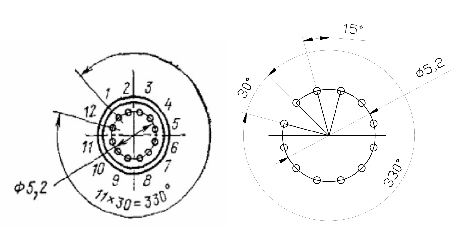Mellékeltem egy részben méretezett pontos ábrát, amin a szögeket feltüntettem. A 11x30° + 30° az éppen egy teljes kör, tehát ez egy óralap kiosztás, csak 15 fokkal elforgatva. Szerintem ilyet is rajzoltál (lusta voltam ellenőrizni), de a szövegben 5°-ot írsz. Hol értelmezed az 5°-os elforgatást?
