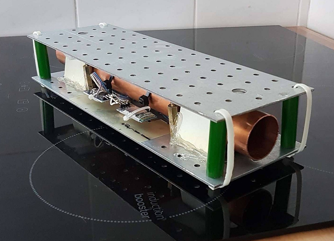 A faék egyszerû programot megtaláltam (látszik hogy ezt sem gondoltam túl, bruttó 110 sor), illetve a szenzorok panelját (nincs is más saját panel benne), meg a kész berendezést. A készülékhez amit itthon találtam, egy kb. 4cm átm. réz csövet, két horganyzott faipari lyukacsos lemezt, meg pár mûanyag lapot/csövet használtam fel. A csô két szélénél 50%-ig be van vágva, ide lát be a szenzorpanel, felül egy-egy IR led világít lefelé. A két vágás közt 20cm távolság van. A szenzorok (5mm szélesek, opto schmitt triggerek, oc kimenet, ez volt itthon sok) bármelyike felett elrepülô légpuskagolyót érzékeli, nincs igazán holttér ami miatt aggódni kellene. Tápellátása 4db AA akku, semmi stabilizálás, kb. 5V. Miután alig áll pár alkatrészbôl, így kapcsolási rajzot nem csináltam hozzá.