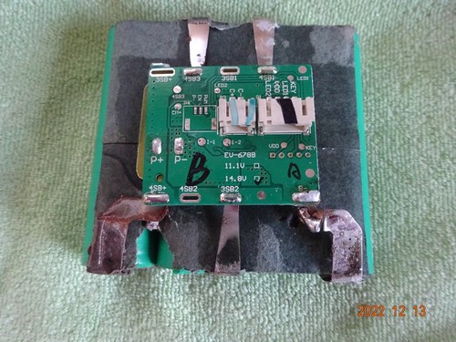 Köszönöm a választ, sajnos csak most jutottam újra géphez. Szétszedtem a ketyerét és körülnéztem benne. 4 db SF 1865 ONR-22 2200mAh Lipo aksi van benne sorba kötve (elvileg 14,8 V). 1-4-ig a cellafeszültségek: 4,11; 4,09 és 4,08, de a 4-en fordított polaritással 10,86 V. Az akksikon egy öt kivezetéses töltő (szabályzó) áramköri panel van. Ha a 4. akksit lekötöm, akkor azon továbbra is fordított polaritással de már csak 0,33 V mérhető (saját kapocsfeszültsége). Szóval úgy néz ki, hogy ez kuka. Ha pótolnám a rossz cellát, hiszen a másik három jónak zűnik, akkor az a kérdés merül fel, hogy a töltőáramköri panel nem sérült-e meg? Sajnos nem találtam kapcsolási rajzot róla: EU-678B. Hét csatlakozási pont van rajta: 1-2 csatlakozás (cs) + - táp, 3-4 cs. + - 14,8 V a pakk két végére, 5 cs. az 1. és 2. akksi közös pontja, 6. cs. 2. és 3. akksi közös pontja, a 7. cs. a 3. és 4. akksi közös pontja. Próba szerencse? Kicserélve a 4. akksit hasonlóra kössem rá az elektronikát, és ha működik, akkor jó, ha nem hát nem. Sajnos nincs jobb ötletem. Köszönettel: Cserga