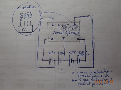 Kösz a gyors reagálást! Készítettem négy fényképet és egy vázlatot a cuccról. Az akksikat balról jobbra számoztam 1-4-ig. 1 kép a pakk előlnézete, 2. kép alsó nézet, 3. felső nézet, 4. a bemeneti +- táp és a kimeneti négy tűs aljzat, 5. ábra a képek alapján. Remélem tudtam segíteni. Üdv: Cserga