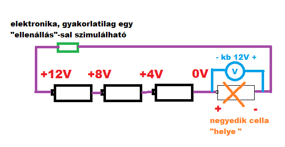 Lerajzoltam, hogy jön ki a 4. cella helyén a fordított feszültség. Az töltő/bms elektronika felfogható egy soros ellenállásnak, valamekkora vezetése van, ha a negyedik cella szakadt, akkor ott biza megjelenik a fordított polaritás... Igazából pont ugyanaz az eset, mikor a sorbakötött akksik közül a leghamarabb lemerülő terhelés alatt fordítva polarizálódik át.
