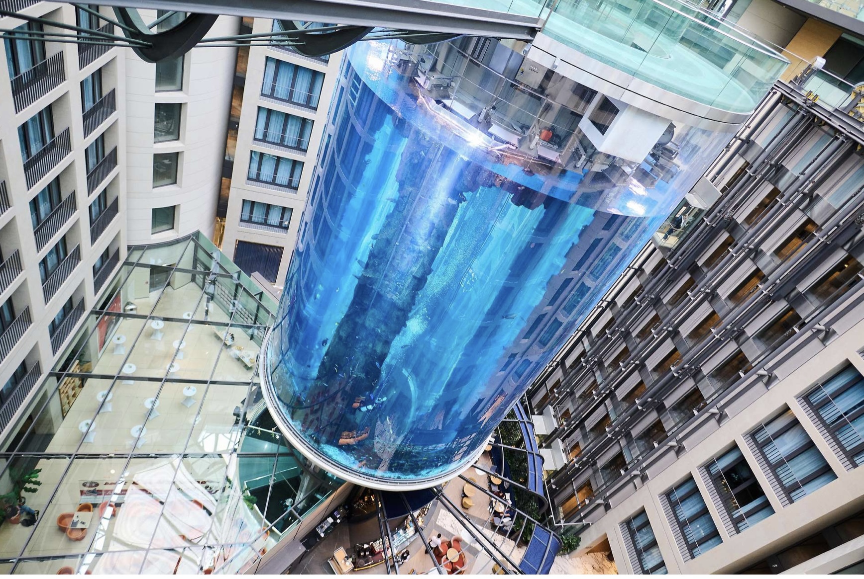 A kèpen láthato az egész. Alatta volt a szálloda portája, az akváriumban volt egy másik üvegcsö amiben egy lift volt a vendégek számára, azaz a halak között juthattak fel a szállo felsö (5.) szintjére.