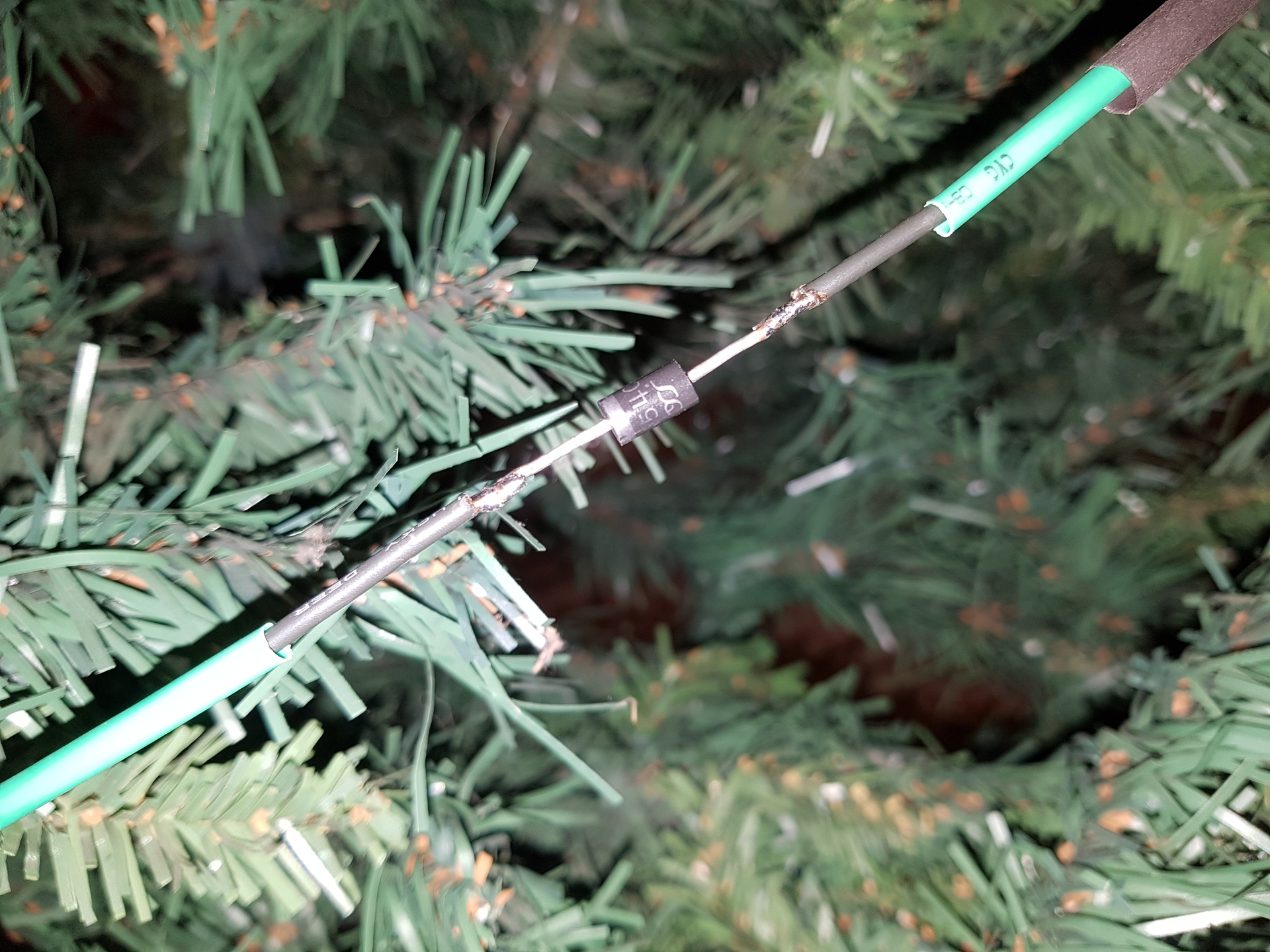 Ezért hirtelen kellett valami praktikus megoldást találni, lehetőleg olyat amit képes vagyok létrehozni. Volt bennem bizonytalanság, de azt árammérés nagyon megnyugtató eredményt hozott. Átalakítás előtt 137 mA volt az áramfelvétel, utána pedig 68 mA. Az izzók melegedése is teljesen normális lett, kézzel még éppen tapinthatóak (kb. 50 °C). A vezetéket elvágtam egy alkalmas helyen, és egy soros diódát kötöttem az áramútba. Az átalakítás kis helyigényű és könnyen kivitelezhető.