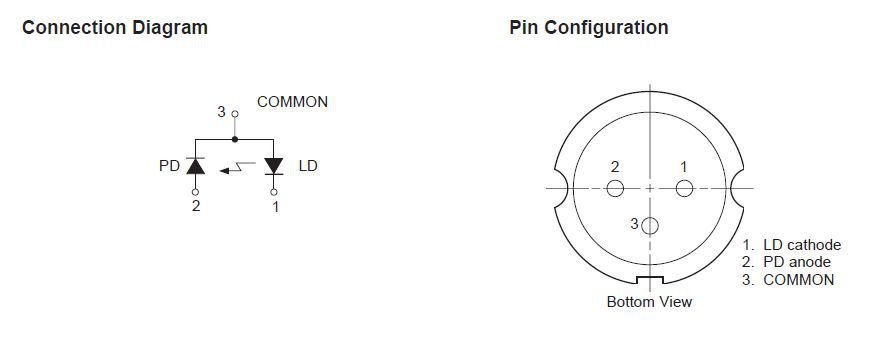 Három lábú a jószág, LD cathode, PD anode, és common. Rajz szerint két dióda szimbólum van sorba kötve, és a közös pontjuk a common.