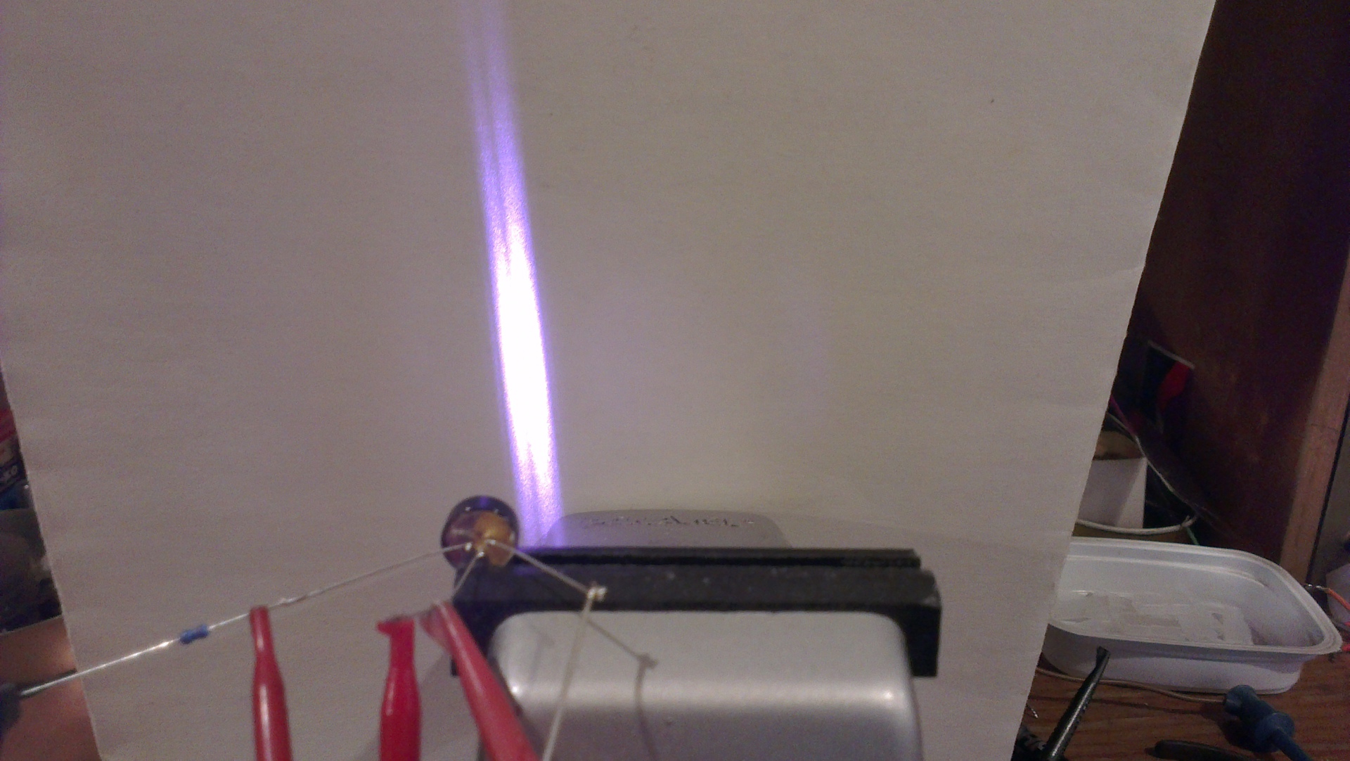 Ami első látásra meglepett az a sugár alakja. Bár belegondolva, a lézer dióda nem a felületére merőlegesen bocsájtja ki a fényt, mint a ledek, hanem a kristály szélén. Ezért is van a félvezető kristály merőlegesen szerelve a tok alapjához viszonyítva.