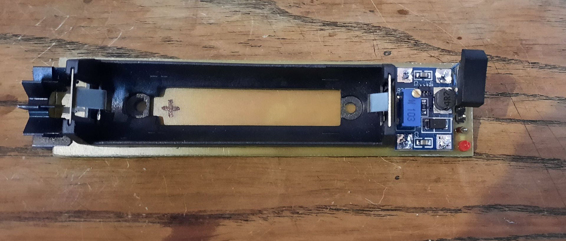 18650-es Li-Ion akkuról megy. Egy STUP-SX1308 ( Hestore ) Step-Up konverterrel van beállítva a fix tápfesz. 4.8-5V A 800mA lézer áramot egy LM317 áramgenerátor állítja be. Ezzel úgy 450mW optikai teljesítmény adódik adatlap szerint. A piros led jelzi ki a bekapcsolt állapotot.