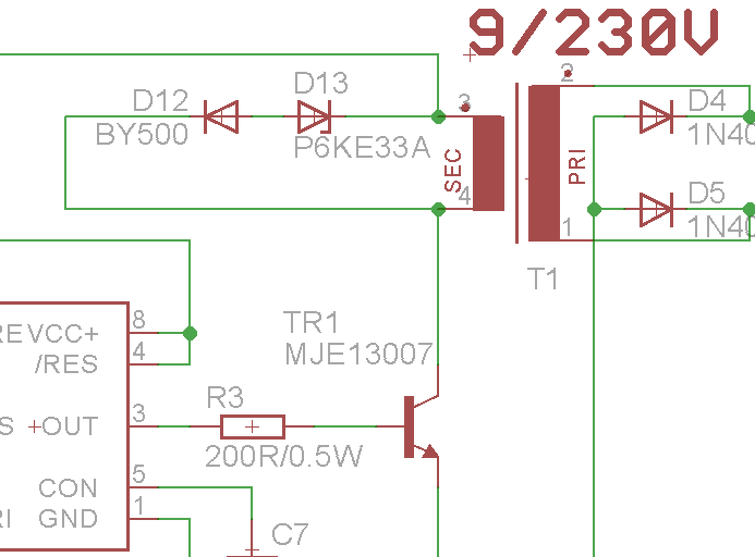Időközben beépítettem egy kis kiegészítést (D12 és D13). Ugyanis az inverterrész meghajtása kísértetiesen hasonlít a lágyindítók tirisztorgyújtó áramkörére (gyújtótrafós, nem optotriakos!). Azonál pedig ott van egy 18V-os zener és egy 1N4148 sorbakötve, úgy, ahogy most az én rajzomat kiegészítettem (P6KE33 és BY500). Így már nem melegszik az 555, és nem is hal le pár másodperces üzem után. Lehet, hogy az OUT és a bázisellenállás közé is illene egy diódát tenni, de a szupresszordiódával megfogott impulzus feleslegessé teszi.