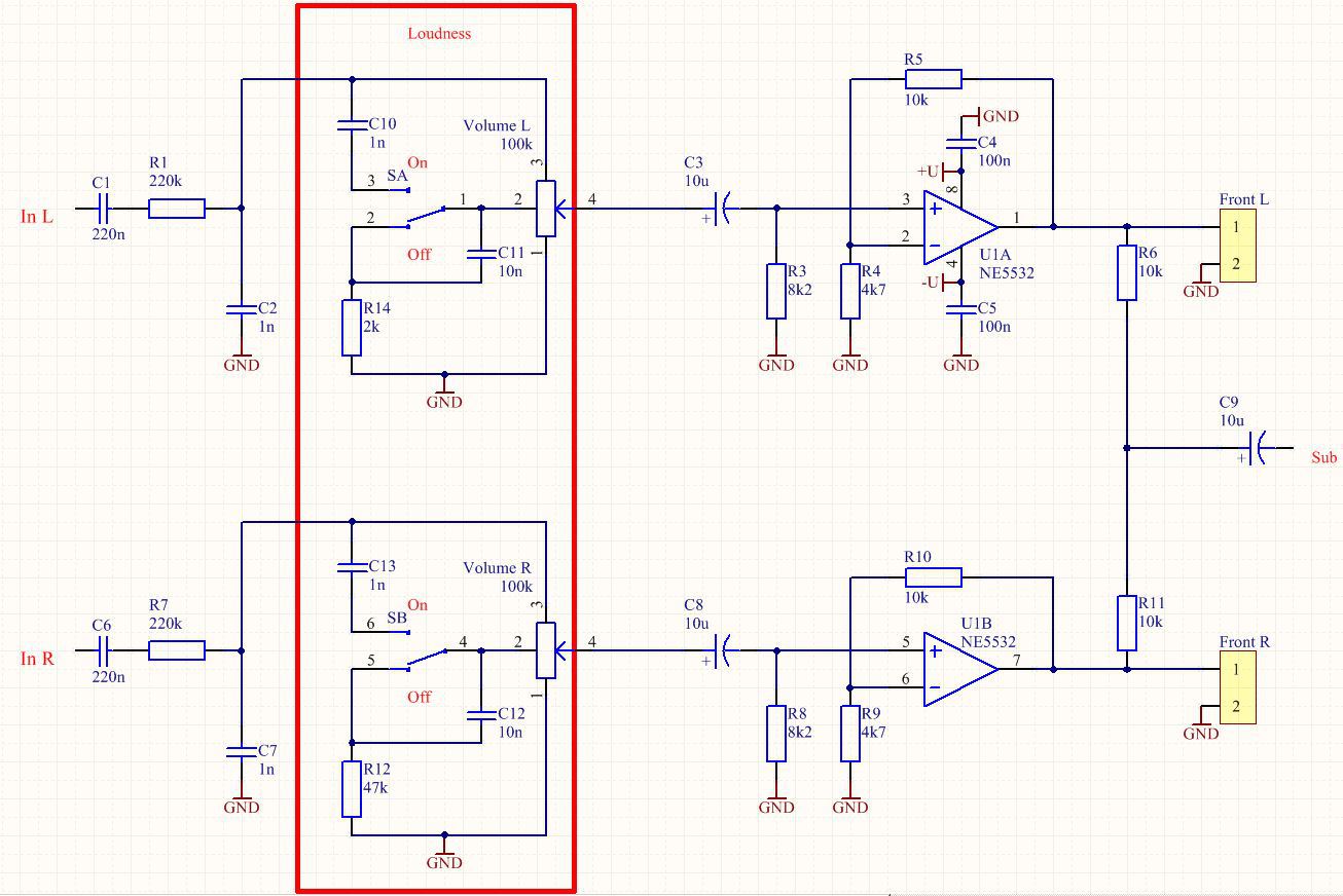 A srác úgy akarná, hogy legyen front vol, bass vol és egy master vol. Ha a loudness potit használom, akkor az viszi magával a sub-ot is. Tehát, ha 1Watt-ra letekerem a frontot, akkor nem tudok mondjuk 10Watt-ot kiengedni a sub-ra. Persze ehhez a sub-ot, a bemenethez kell kötni, a front poti elé. Lehet, hogy nincs sok értelme, de, ha ez kell nekije... Én csak hobbiból megrajzolom. Majd jelentkezem, köszönöm az eddigieket.