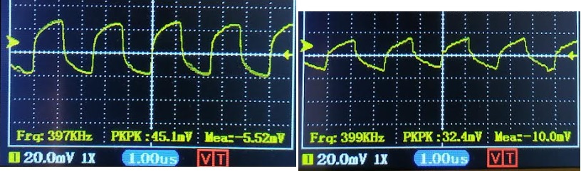 Lehetséges, hogy a kimenetre rakott kondik nem túl jók. Egy ideális kondin a feszültség nem változhat nagyon gyorsan, mert ahhoz nagyon nagy áram kell. Itt mégis vannak feszültségugrások, próbáld megnézni szkóppal, hogy vezérlés nélkül, mekkora ezeknek a pici négyszögféléknek a felfutási, lefutási meredeksége. Valószínű, hogy a kondiknak nagyon nagy az ESR-je, vagyis olyan, mintha egy ideális kondival sorba lenne kötve egy ellenállás. Ezen az ellenálláson pillanatszerüen ugrik a feszültség az áram hatására, ezt látni az élmeredekségeken. A többi lassan emelkedő feszültség a kondenzátor kapacitása miatt van, vagyis a kondik így töltődnek, kisűlnek. Az lehet a fő baj, hogy a panelre nem férne bele egy kisebb ESR-ű kondi. Ide valami nagyon jó minőségű polikarbonát kondi kellene, ezért gondoltam a múltkor, hogy valahogy applikáld a panel mellé, de a lehető legrövidebb lábbal, mert a hosszú lábnak már van induktivitása, meg ohmos ellenállása. Esetleg meg lehetne próbálni 7Xr alapanyagú kondikkal, egymás tetejére forrasztgatva, inkább több darabból.