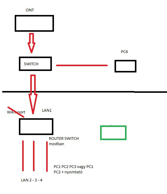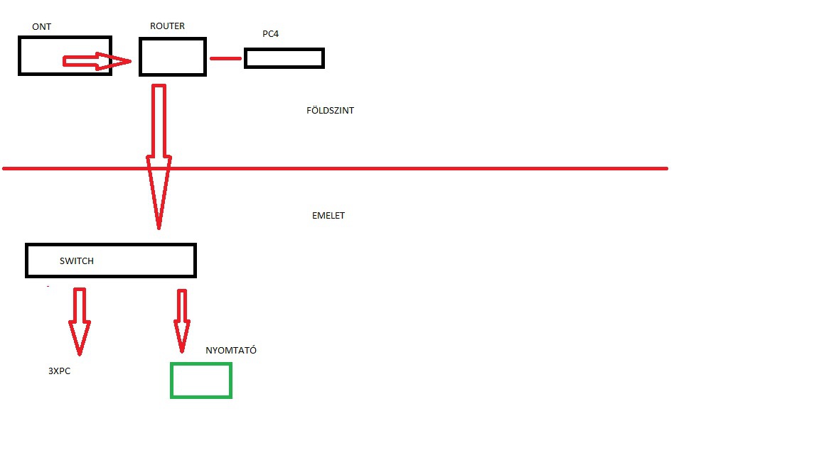 lent hagyod az ONT bridge módba ami kapcsolódik a TL-WDR4300 -hez, akkor a routerben létrehozod a saját hálózatodat. Ha négy portja van a routerednek és 5 eszközt akarsz használni, a router egyik portjára teszed a switch-t ide csatlakoztatod a nyomtatót és a földszinti gépet. Annyi a plusz, hogy nem egy kábel van a földszint és emelet között hanem kettő. Viszont egy korrekt hálózatot hozol létre igy.