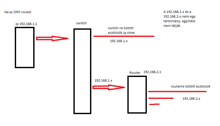 Ha az ONT routerként üzemel, akkor az ő LAN1 portjából megy egy kábel a saját router LAN1 portjába (amúgy mindegy). A saját router kapjon egy fix IP-t mondjuk a tartomány végéről. Illetve ezen legyen kikapcsolva a DHCP, ő ne osszon IP-t. A saját router LAN portjába dugott eszközök látják egymást és a netet is. Az ebbe dugott switch után levők szintén. Ami az ONT további LAN portjába van dugva, azon csak net lesz, belső háló nagy valószínűséggel nem. Ezt a szolgáltató eszközére feltöltött program beállításai határozzák meg, nem lehet állítani. A legtöbb eszköznél nem látják egymást, nincs átjárás, csak net.