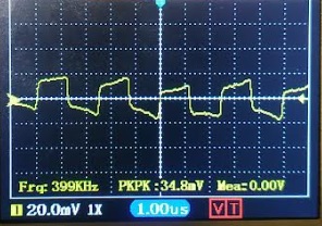 Lehetséges, hogy a kimenetre rakott kondik nem túl jók. Egy ideális kondin a feszültség nem változhat nagyon gyorsan, mert ahhoz nagyon nagy áram kell. Itt mégis vannak feszültségugrások, próbáld megnézni szkóppal, hogy vezérlés nélkül, mekkora ezeknek a pici négyszögféléknek a felfutási, lefutási meredeksége. Valószínű, hogy a kondiknak nagyon nagy az ESR-je, vagyis olyan, mintha egy ideális kondival sorba lenne kötve egy ellenállás. Ezen az ellenálláson pillanatszerüen ugrik a feszültség az áram hatására, ezt látni az élmeredekségeken. A többi lassan emelkedő feszültség a kondenzátor kapacitása miatt van, vagyis a kondik így töltődnek, kisűlnek. Az lehet a fő baj, hogy a panelre nem férne bele egy kisebb ESR-ű kondi. Ide valami nagyon jó minőségű polikarbonát kondi kellene, ezért gondoltam a múltkor, hogy valahogy applikáld a panel mellé, de a lehető legrövidebb lábbal, mert a hosszú lábnak már van induktivitása, meg ohmos ellenállása. Esetleg meg lehetne próbálni 7Xr alapanyagú kondikkal, egymás tetejére forrasztgatva, inkább több darabból.