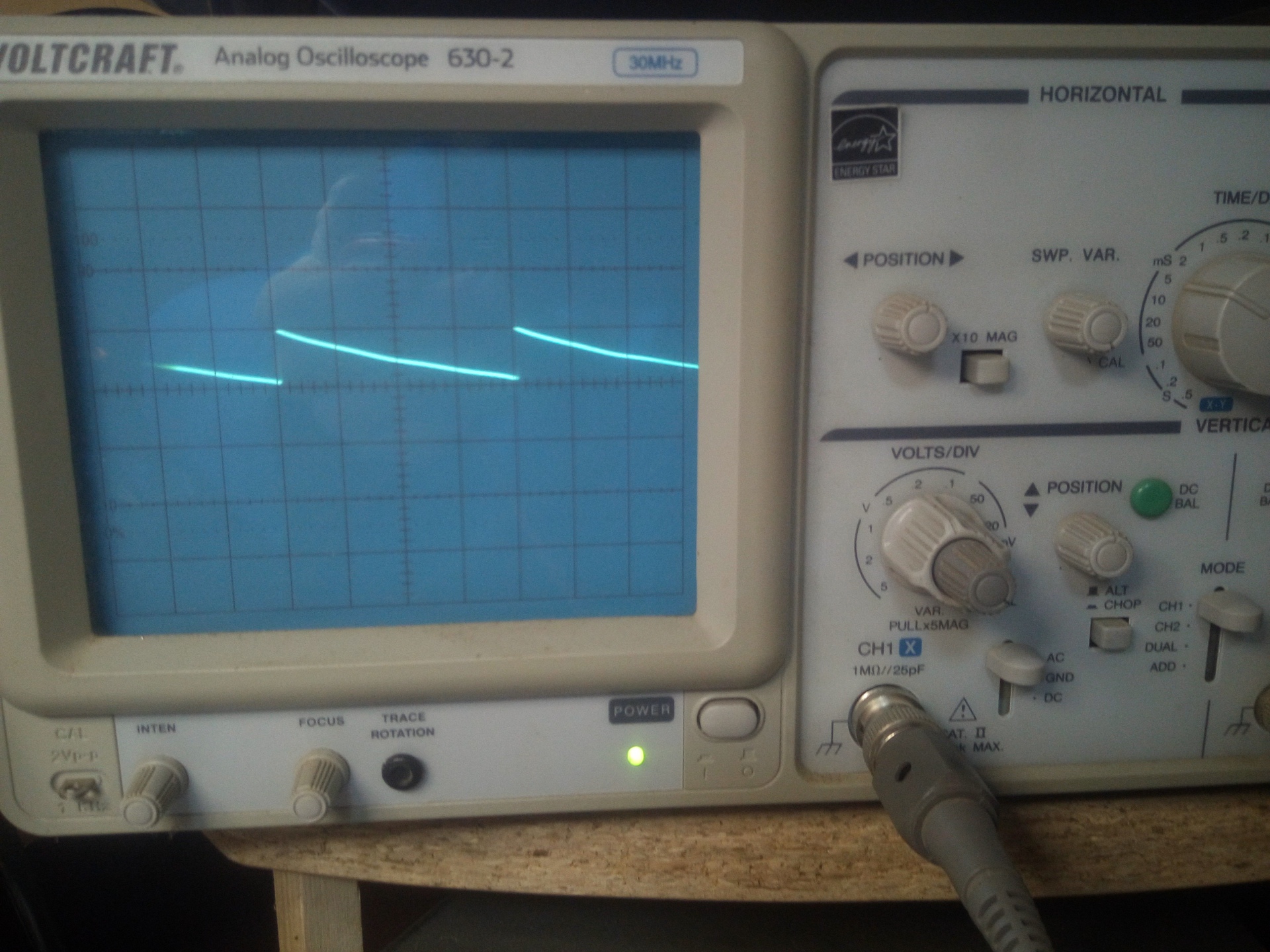 D1 dióda egyik végét kiemeltem. Kimeneten megjelenik a teljes tápfesz, szabályzásra vagy a DC-off kapcsoló zárására nem változik. Viszont eltünt a fűrész.