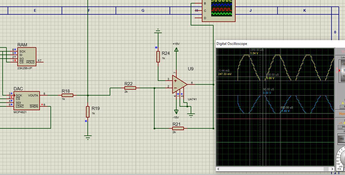 Még nem alakítottam át a javaslataid szerint az áramkört, de egy képet tudok küldeni arról, mi van, ha direkt kötöm a DAC-ot az első ua741 bemenetére. Sejtésem szerint mivel a DAC kimenete alacsony impedanciájú, áram folyhat a ua741 felé és zavart okoz, mert ez az áram befolyásolja a visszacsatoló kört. (ua741 bemenete nagy ellenállású, ezért gondolom, hogy a visszacsatoló körben okoz problémát) Legalábbis ezt gondolom, lehet totál hibás a gondolatom. Másfajta op amp-nál nem jelentkezik ez, de ez a fajta van itthon dögivel, ezzel szeretném megoldani.