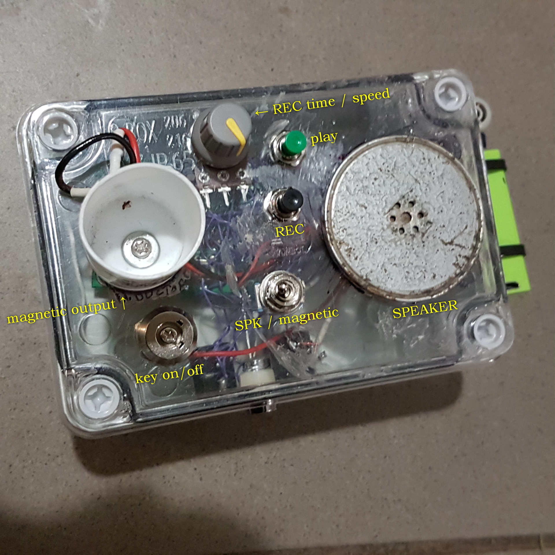 ![]() Átlátszó tetejű villany dobozba került, ezen a modulon alapul. ● status LED ‒ fehér színű visszajelző, felvételkor világít, lejátszáskor villog ● input ‒ akár vonalszintű jelet is rá lehet kötni ● output ‒ bármi csatlakoztatható ide, a beépített lehetőségeket leválasztja ● magnetic output ‒ furcsának tűnhet, de a fehér műanyag serlegbe kell behelyezni egy jack dugóra szerelt induktivitást, mert csak így játszható át a modul tartalma számítógépre ● key on/off ‒ kulccsal le lehet kapcsolni az elemet az áramkörről ● SPK/magnetic ‒ váltókapcsoló a kétféle beépített lehetőség között ● play ‒ zöld gomb, megnyomásra lejátssza a teljes tartalmat egyszer, ismételt megnyomásra abbahagyja ● REC ‒ fekete gomb, a gomb nyomva tartása esetén készít felvételt ● REC time / speed ‒ maximum 40sec hosszúságig tekerhető fel, lejátszáskor sebességet állít ● SPEAKER ‒ hangszóró, régi telefonhallgató, a dobozba ragasztva lett ● mic. ‒ doboz oldalára rögzített mikrofon ● 400mAh kapacitású, microUSB töltésű 9V "elem" |