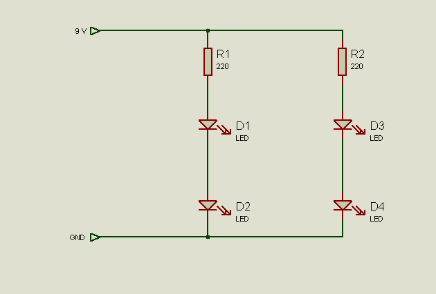 Köss sorba 2 ledet, aztán 47 ...68 ohm soros ellanállással kösd rá a 9 voltos adapterre. A másik kettővel ugyanígy csináld meg. Elvileg 15-20 mA fog átmenni rajtuk ( átfolyatott áramnál nem 3-3 volt esik a ledeken ).