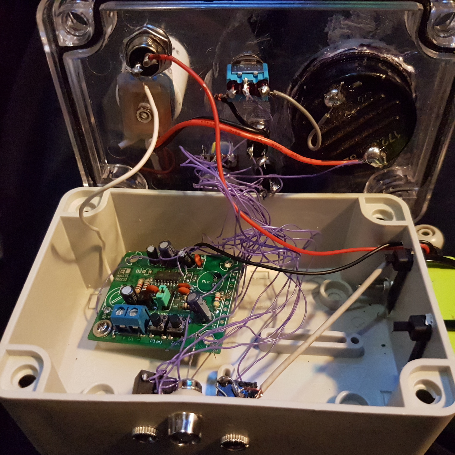 Emiatt próbáltam úgy befúrni alkatrészeket, hogy kicsit elfedjem a felszántott felületeket. A csatlakozók azért kerültek az oldalára, hogy ne fölfelé álljanak ki a kábelek a dobozból, oldalt nem tudnak útban lenni.(Valóban, tényleg egyáltalán nem használtam még vonalzót se.) Idézet: Ilyen lila vezetékkel van kábelezve, ami kissé "kulturálatlan spagettit" formál. Maga a modul panelje egy csavarral van rögzítve a doboz aljára, mivel olyanok a lehetőségek. „Megnézhetnénk a dobozt kinyitva is ?”