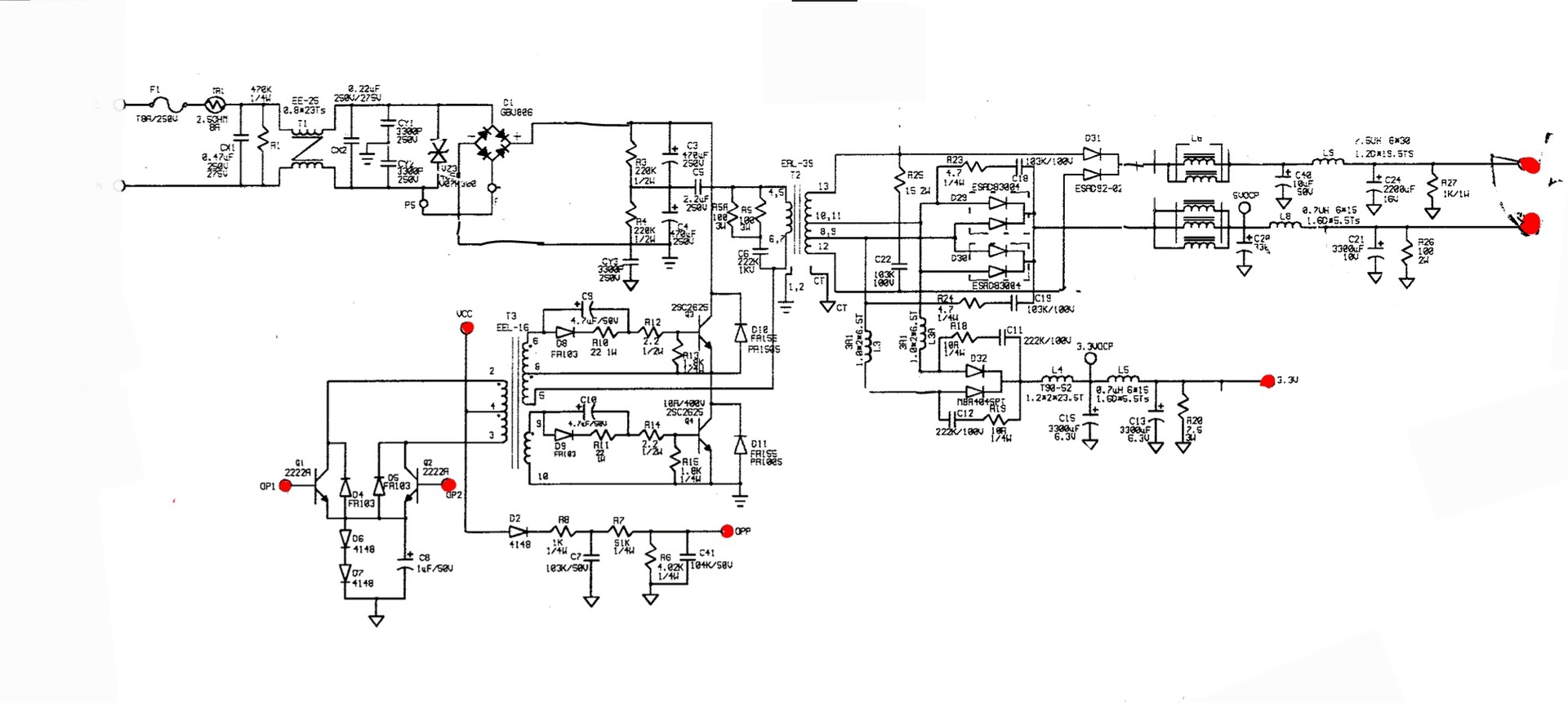 A képen látható részt kötném párhuzamba az eredeti táppal, a pirossal jelölt pontokon. Tehát a meghajtó trafót, kimeneti 3.3v, 5v, 12v is össze lenne kötve, ezáltal nem tudnám félreterhelni, hogy az egyik főtrafót jobban leterheljem.