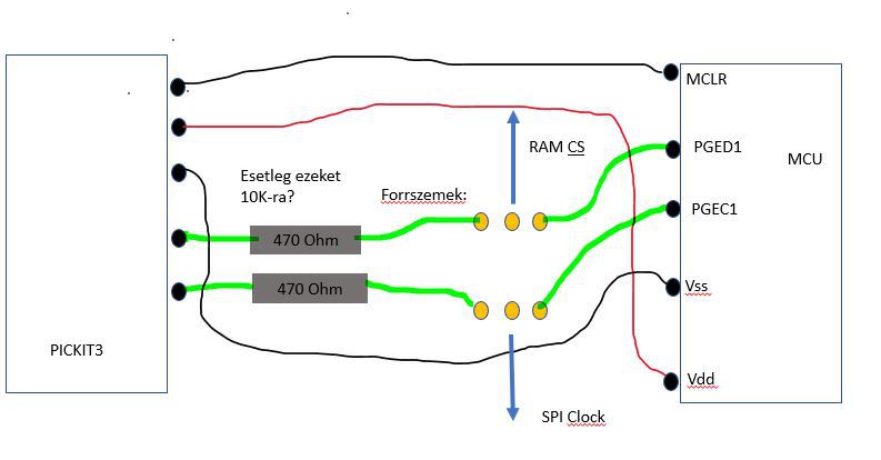 A táp átkapcsolása jó megoldás lehet programozáshoz, de arra figyelni kell, hogy minden ami áram alá kerül programozáskor, az bírja azt a feszültséget (például ha a programozó 5V, de az áramkör 3.3V). Illetve, hogy a két tápot véletlenül se kapcsoljuk egymással szembe! Én a negatív oldalt közösnek szoktam hagyni és csak a pozitív oldalt teszem kapcsolhatóvá. Legutóbb két tüskével oldottam meg, ami normál módban egy jumperrel zárva van, és így táplálja az áramkört, programozáskor pedig az egyik tüskére megy a programozóból jövő táp. (Ha a negatív oldal egyszerre be van kötve a saját tápjáról és a programozóról, akkor pedig arra kell figyelni, hogy ne legyen földhurok!) A programozó lábak használatakor arra kell figyelni, hogy programozáskor ne tegyünk tönkre valami perifériát, illetve a perifériák ne zavarják a programozást. Ez egyedi elbírálást kíván, hogy kitaláljuk mi fog történni programozáskor, előáll-e valami nem kívánt eset? Tönkretevés ellen biztos védelmet ad, ha van a PIN-ek között van egy 470Ohm ellenállás. Ez 5V esetén kb 10mA korlátot ad, amit elbírnak a csipek, lásd adatlap. Például ha a programozó direktben van az MCU lábakra kötve, de a periféria 470Ohm-on keresztül, az jó megoldás. A PICKIT programozót elvileg direktben kell az MCU lábaira kötni, ha helyesek a neten talált rajzok. Sajnos nem találtam dokumentációt arra nézve, hogy a PICKIT lábainak kimeneti ellenállása mekkora. Klónoknak van kapcsolási rajza, de eredetit nem találtam. Úgy tudom, hogy a programozók kimeneteit egy nagyimpedanciába is kapcsolható bufferrel szokás megvalósítani, azt tippelném, hogy egy gyári PICKIT 3 is ilyen, de klónok esetén már bármi elképzelhető. Egymás zavarása ellen véd, ha programozáskor a periféria nincsen táplálva, aktiválva, vagy ha a periféria sokkal nagyobb értékű ellenálláson keresztül van bekötve, mint a programozó. Tehát a 470Ohm-os ellenállás erre is jó, a programozó majdnem tökéletesen tudja vezérelni a vonalat függetlenül attól, hogy a periféria "mit akar". (Feltéve, hogy a PICKIT kimenetén nincsen ellenállás. Ha van rajta például 470Ohm, akkor a perifériát péládul 10kOhm-mal leválasztva megint csak a "PICKIT lesz az erősebb".) Mivel a RAM számára ezek a lábak bemenetek, ezért nem lesz problémád. Az esetedben szerintem a RAM-ot működésre fogja bírni a programozó, de mivel a RAM számára ezek input lábak, ezért nem fog hibát okozni. A RAM kimenetei ne legyenek szembekötve a programozóval közvetlenül! Amikor a PICKIT végez a feltöltéssel, akkor szerintem "magas impedancia" módba teszi a lábait, azaz úgy csinál mintha ott sem lenne. Tehát nem zavarja a működést. De biztos nem vagyok benne, utána kell nézni, vagy ki kell próbálni. A próbához be lehet tenni egy 470Ohm-os ellenállást a PICKIT és a PIC lábai közé, hogy biztosan elkerüljük a szembe vezérlést. Ha a PICKIT lábán a feszültség követi a PIC lábán lévőt (akár multiméterrel is mérhetjük, ha egy lassan váltogató próbaprogramot írunk), akkor az azt jelenti, hogy magas impedancia módban van.