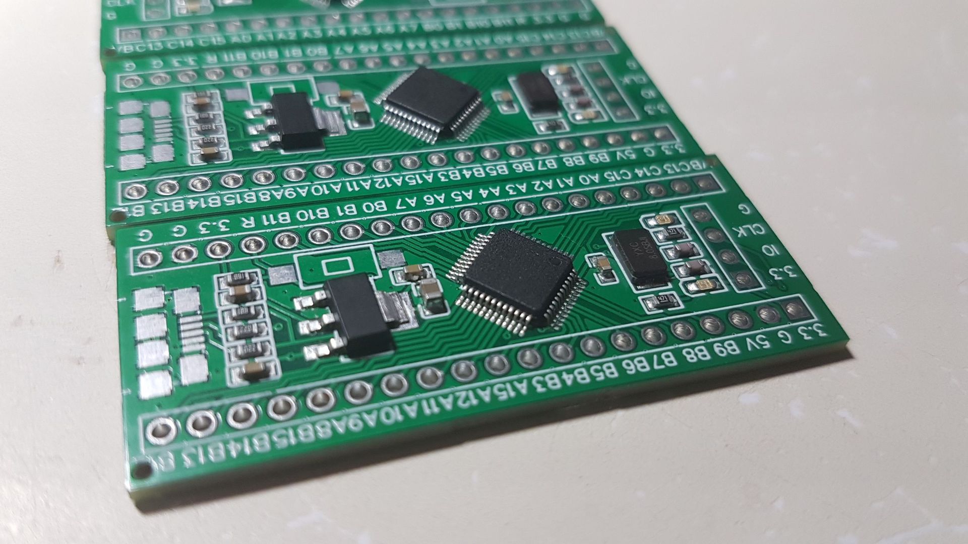 Annyira tetszett nekem a Bluepill mérete, hogy terveztem is egy ilyen panelt, és a jlcpcb-nél rendeltem egy csomót. Felébe F303 került, ez láb kompatibilis és nagyon hasonló a perifériákban az F103-hoz, csak mindenből kicsit több vagy jobb van benne. Másik felébe meg Gigabyte klón került. Csak egyik oldalon van alkatrész, a jumpereket pedig elhagytam, így laposabban beépíthető.
