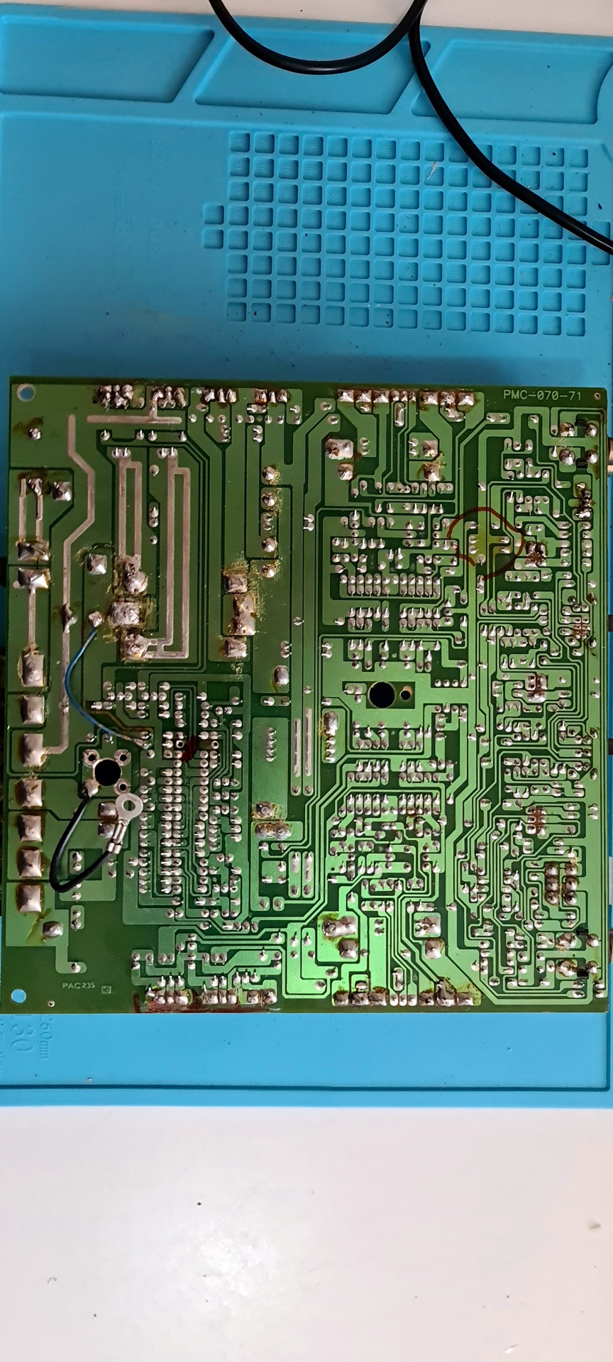 A hosszú ic melleti 4db pad ha megnézed össze van kötve és gnd van rajta. Onnan nem hiányzik diódahíd. Rajzod megvan hozzá? Be tudtad azonosítani a dcdc táp kimeneteit (tápszűrő nagy kondik) és megmérted van-e rajtuk testhez képest zárlat, bekapcsolva meg megvan-e a tápfesz?